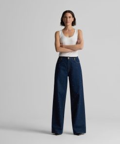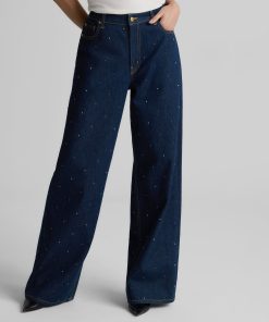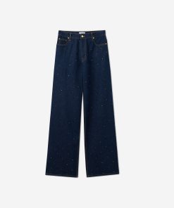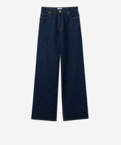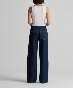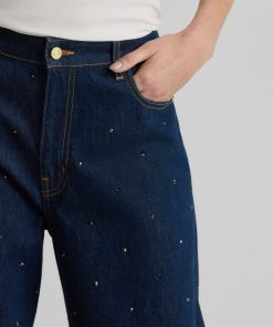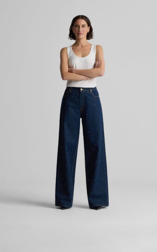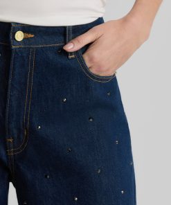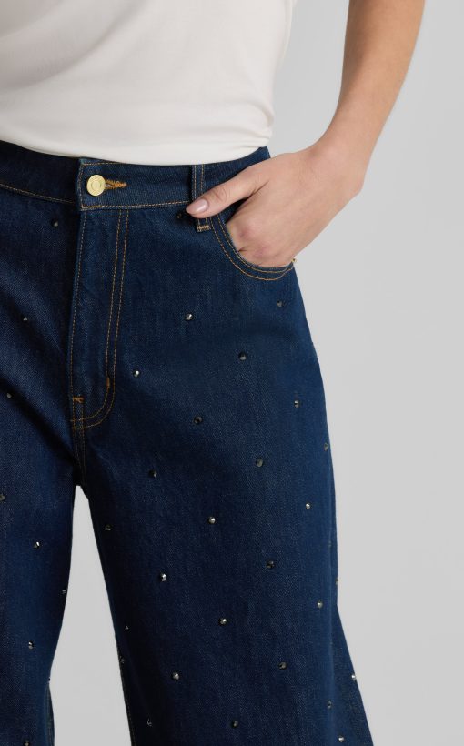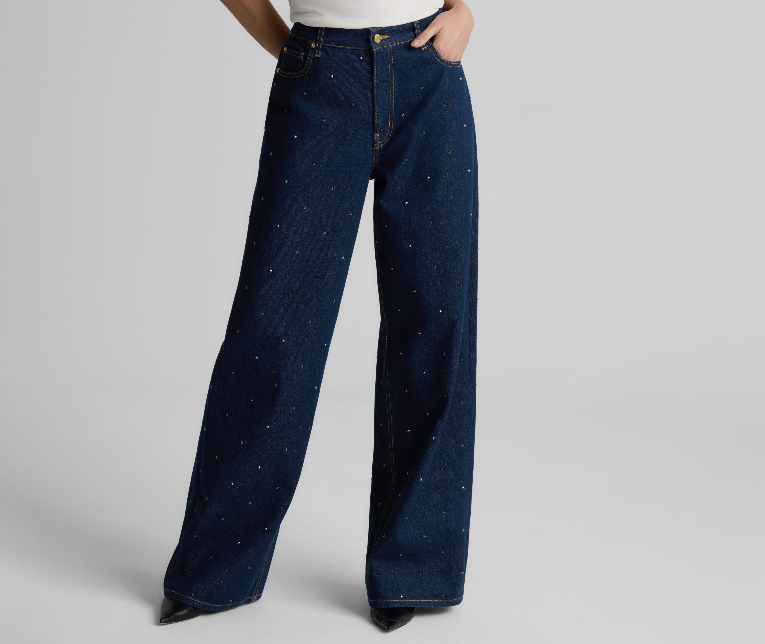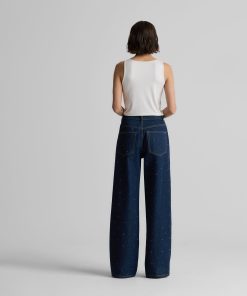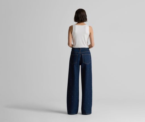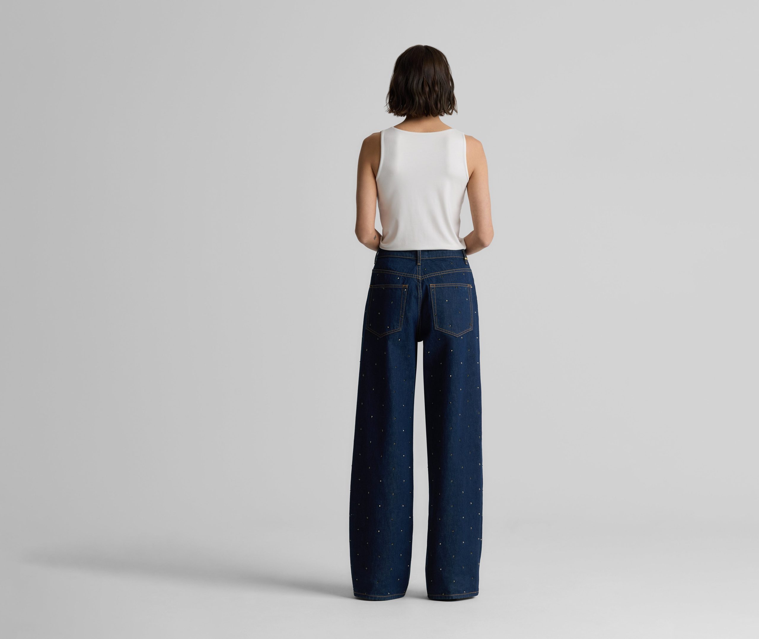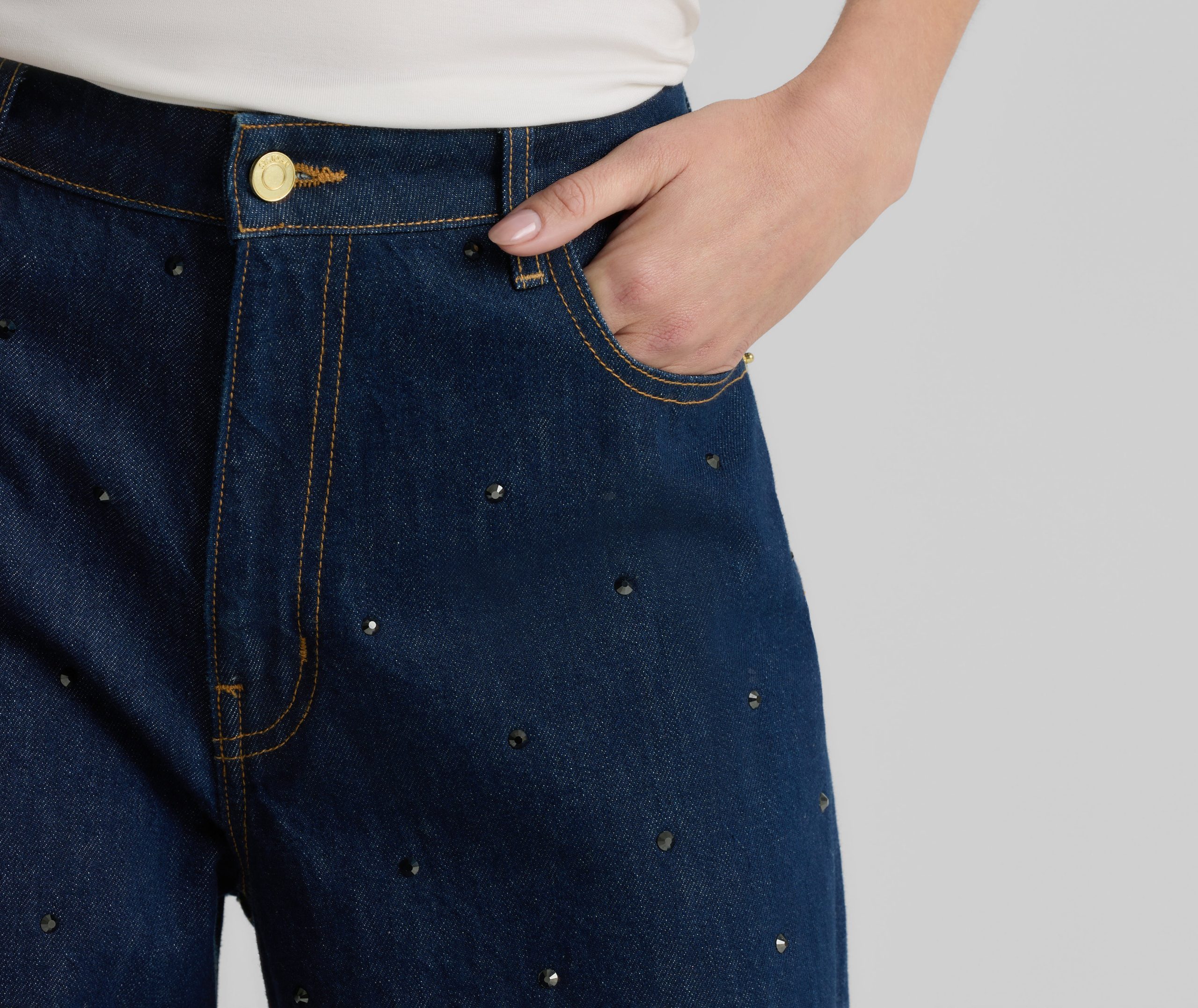 A graceful balance of ease and brilliance. These oversized denim pants are gently adorned with scattered rhinestones, offering a soft shimmer that catches the light with every step. Designed to drape fluidly, they bring refined polish to both crisp shirting and relaxed knits — effortlessly from day to night.