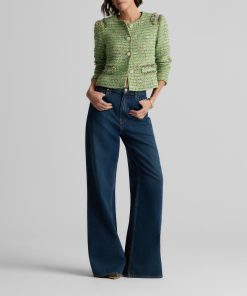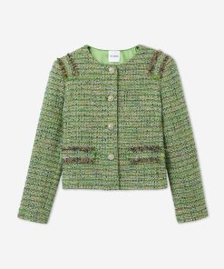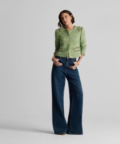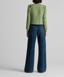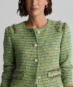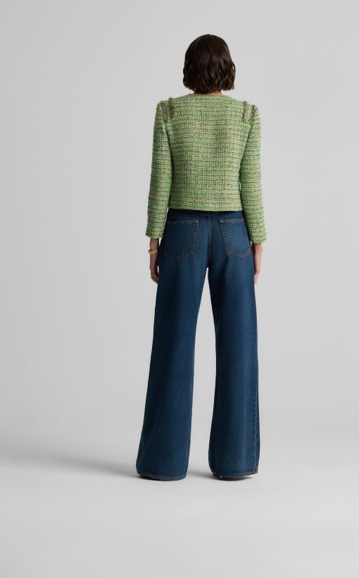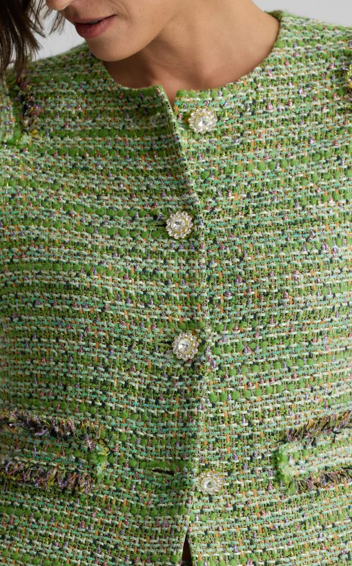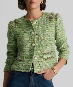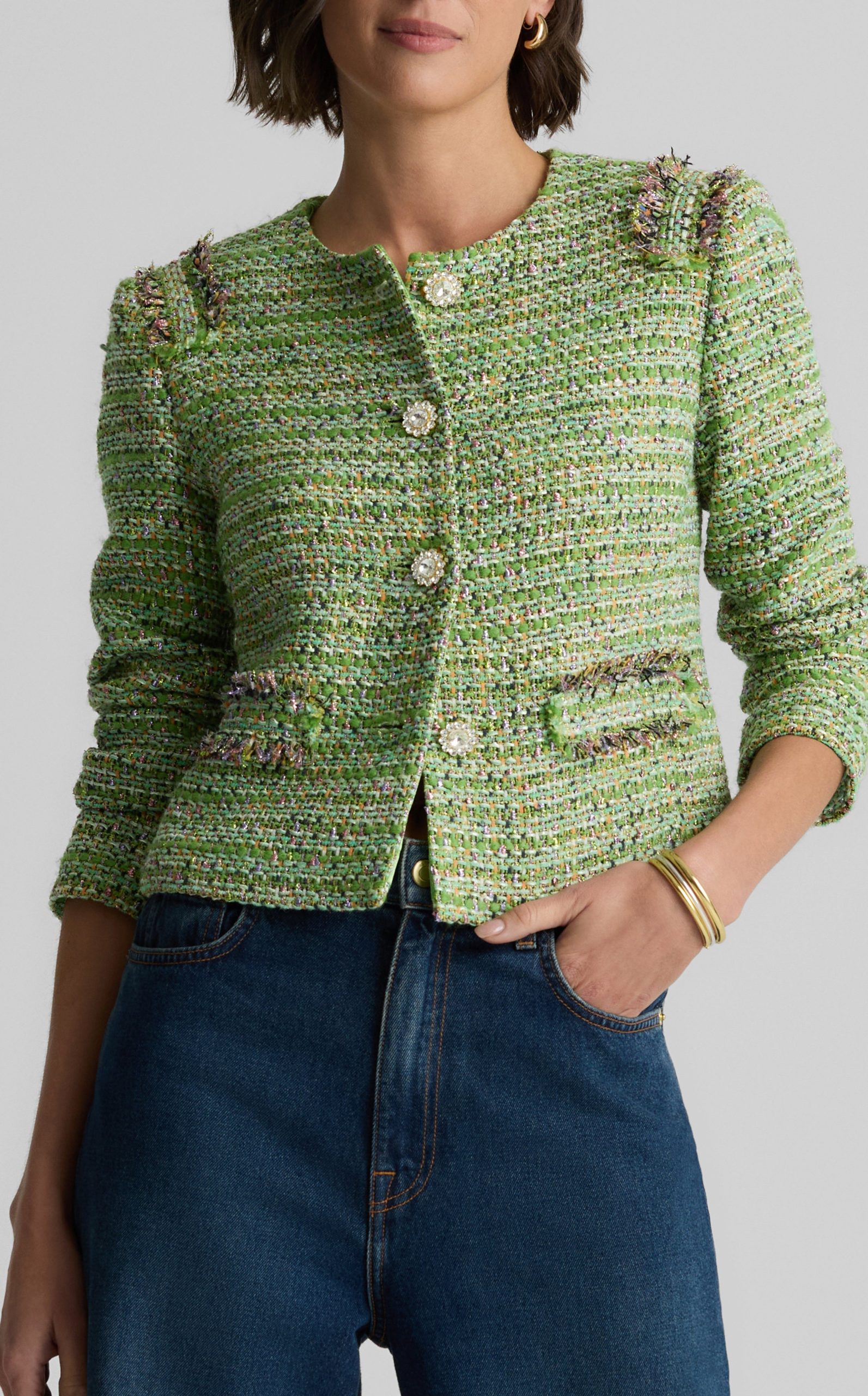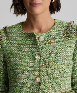 The Arden takes a timeless tweed staple to glamorous new heights. Made in our metallic striped Lenox Tweed and embellished with bejeweled buttons and fringe detail, this crewneck, straight sleeve jacket makes for a striking addition to your evening wear collection.