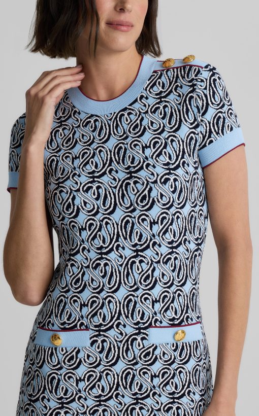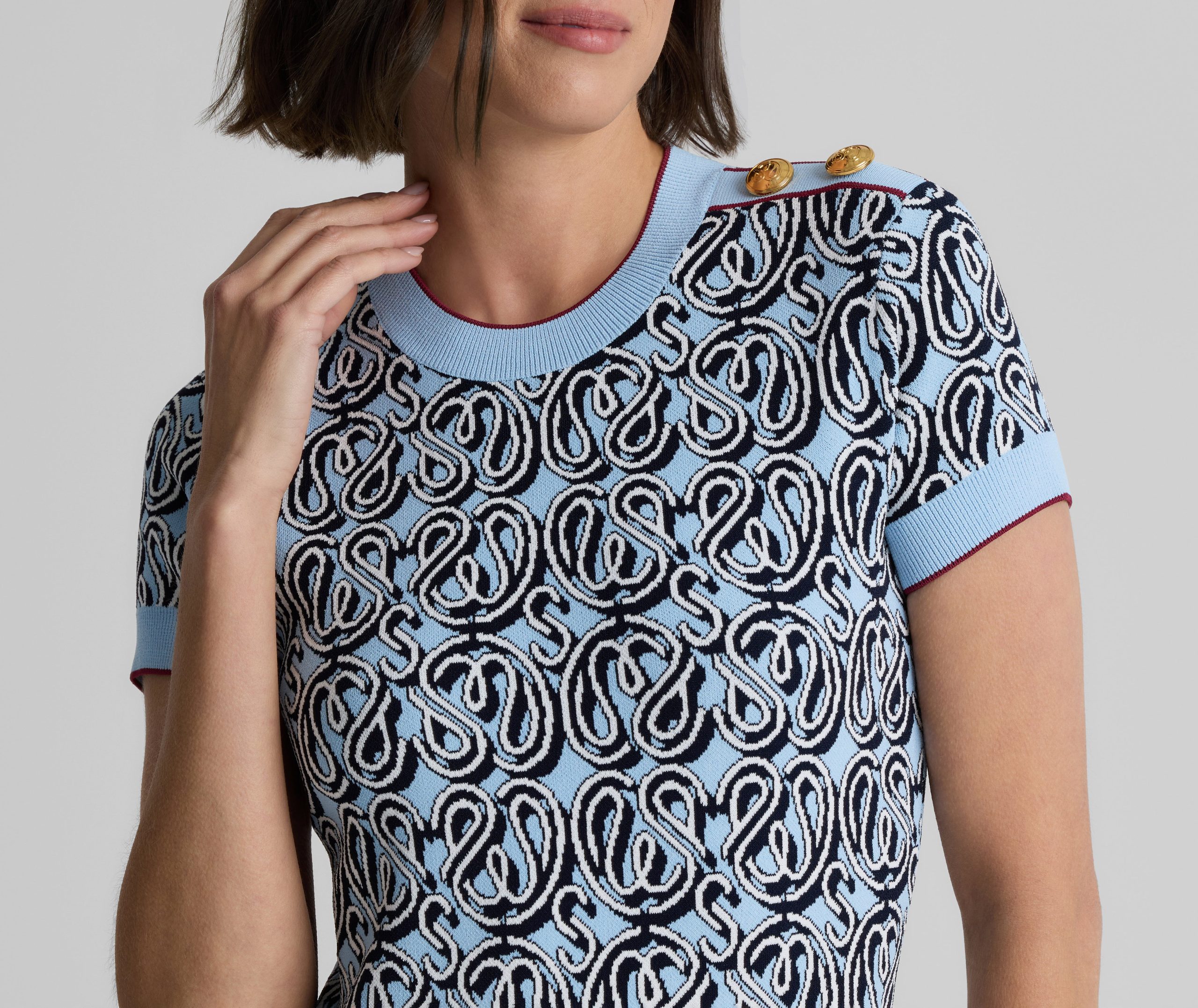 Created in an exclusive collaboration with influential golf brand Malbon, the Bekah’s customized logo print brings timeless luxury to on-the-course moments and other elevated afternoon activities alike. Logo-embossed gold buttons add to the sophistication of the all-over pattern while the curve-hugging fit, crew neckline, and t-shirt sleeves make this dress supremely wearable for a multitude of casually elegant moments.