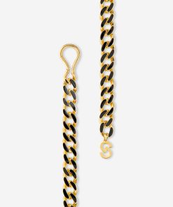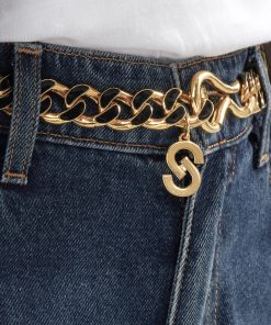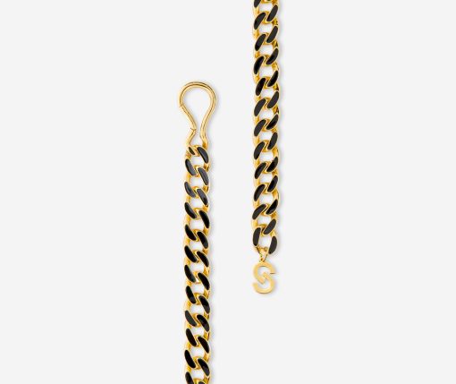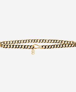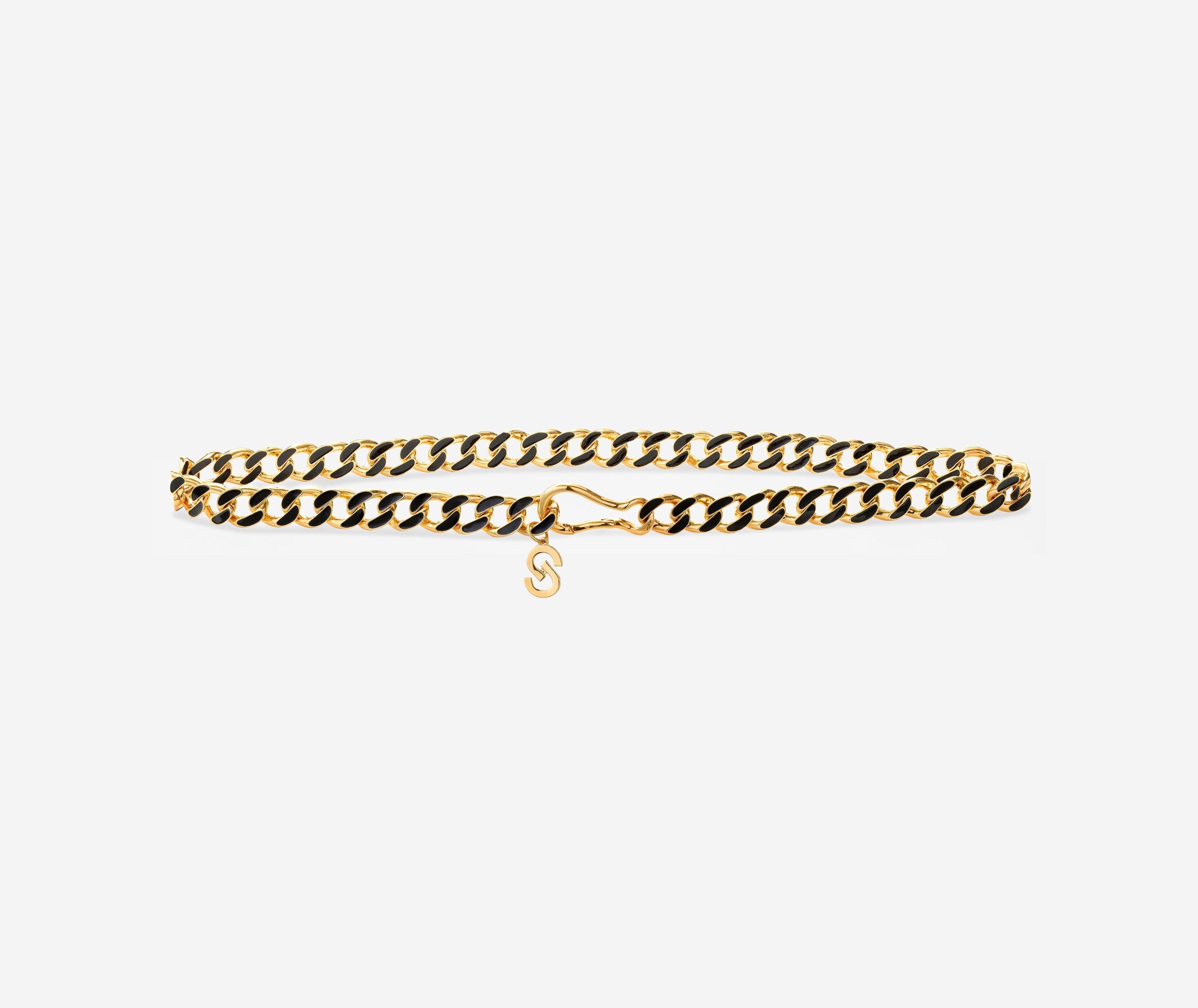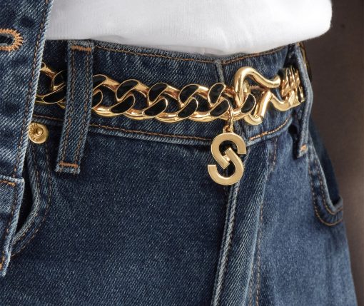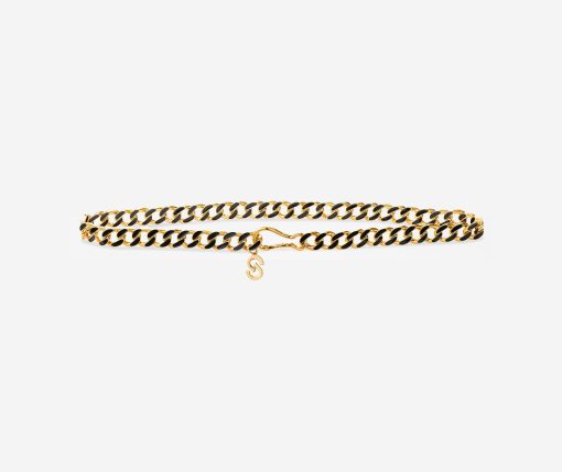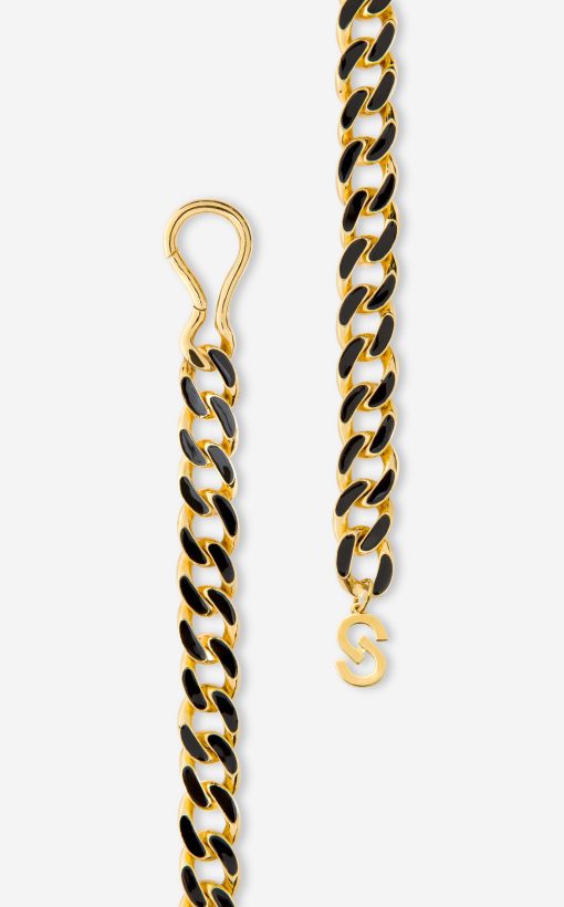 Black and gold links form a glamorous belt, as a gold clasp closure hugs the waist in front or back.