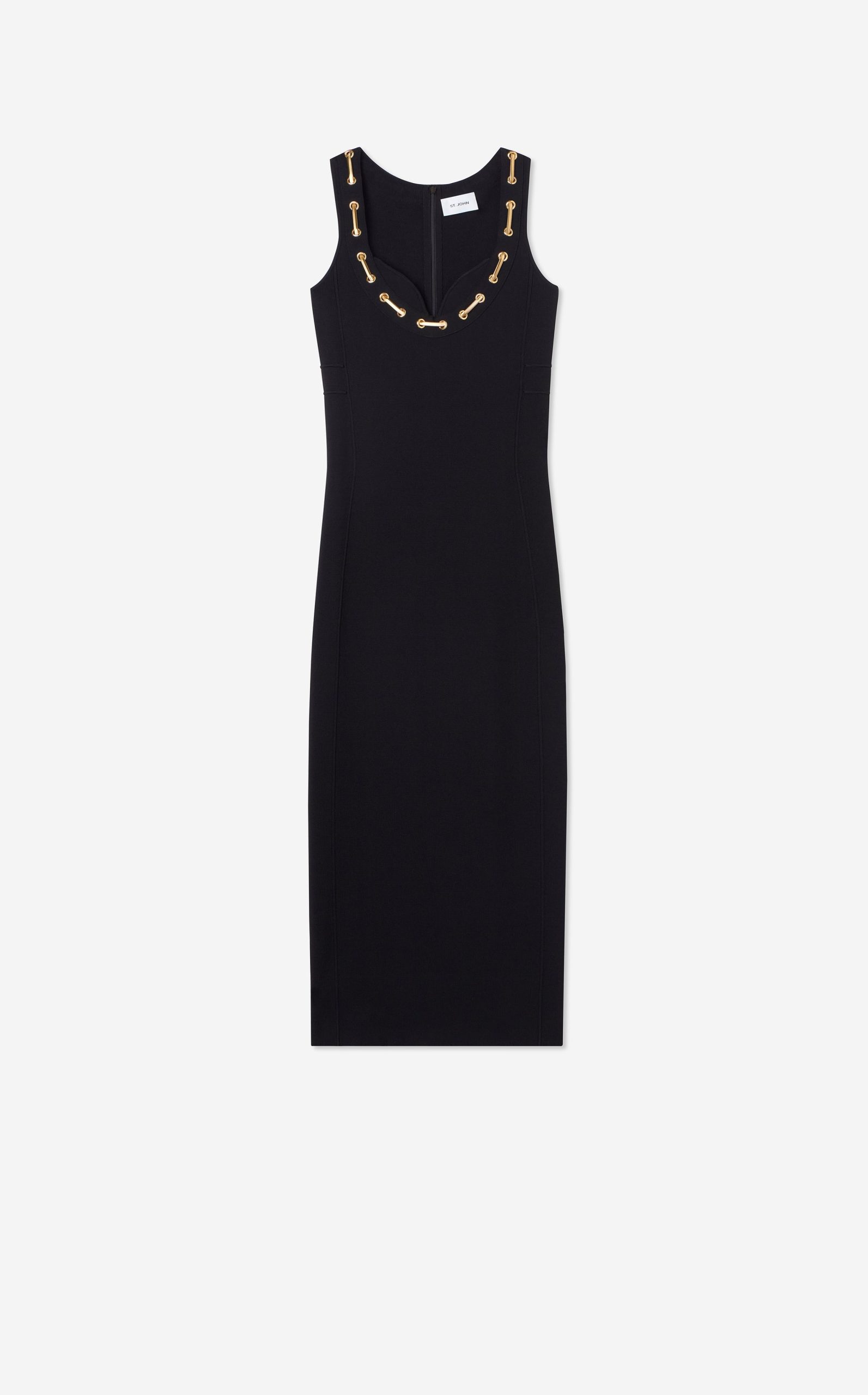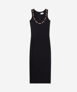 A woven chain detail adds edge to a sweetheart neckline in this sleeveless Milano knit short dress, as golden touches bring drama to the back.All Sales are Final. No Returns or Exchanges.
