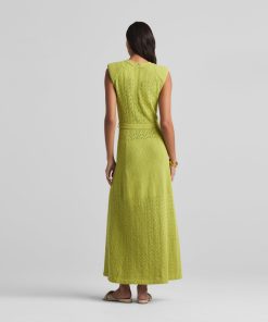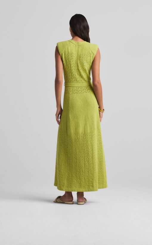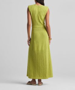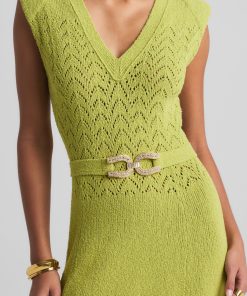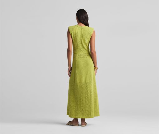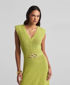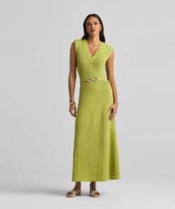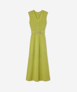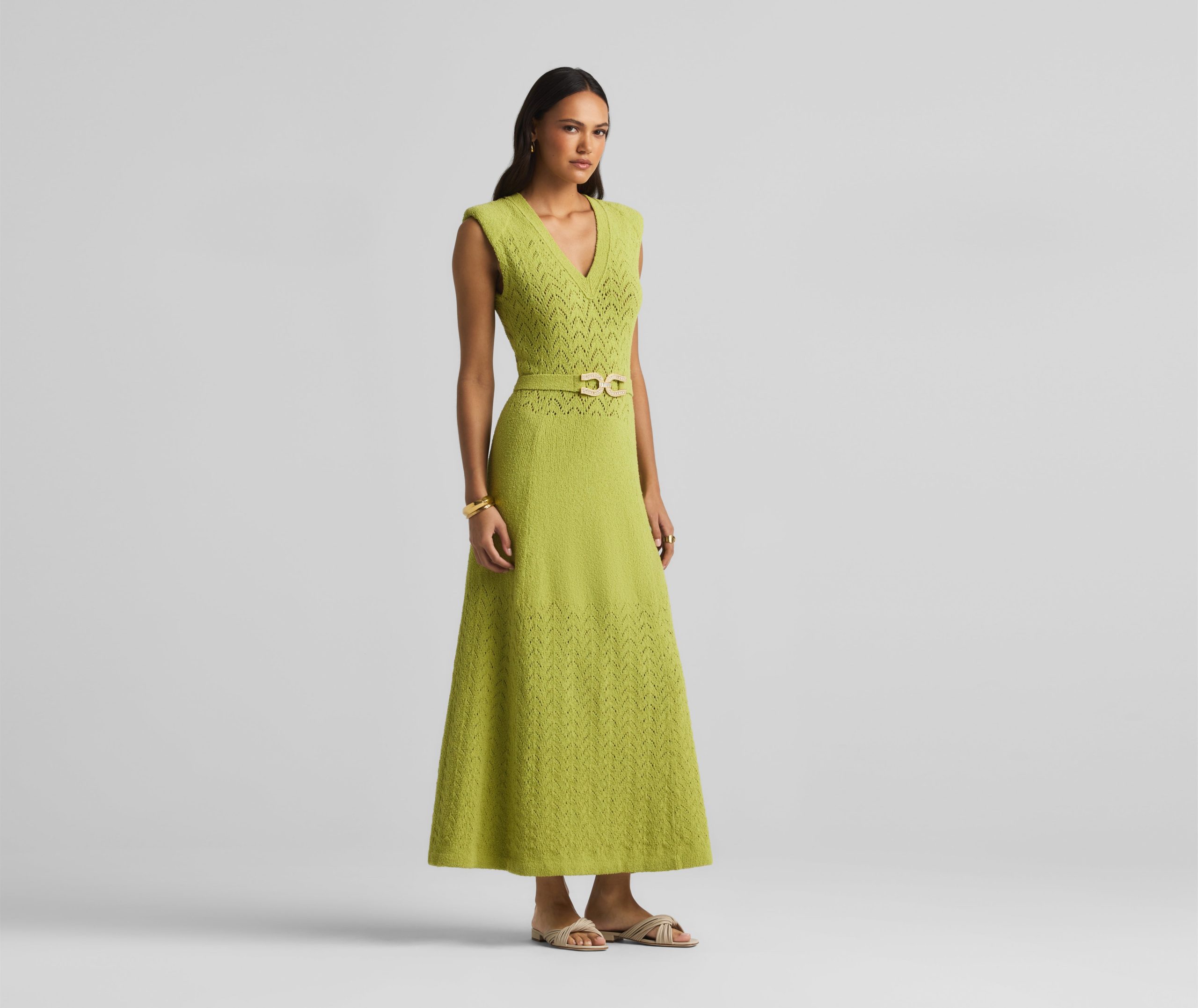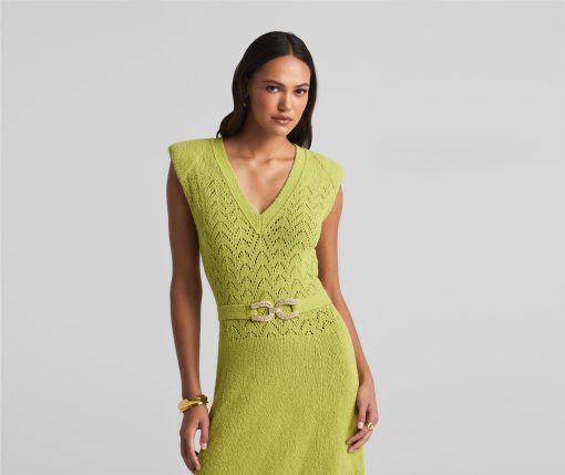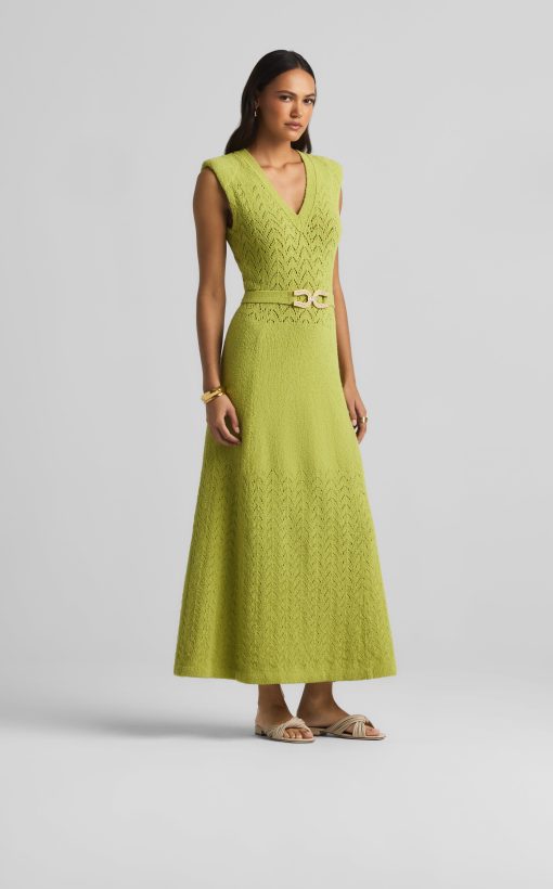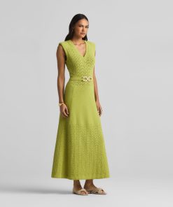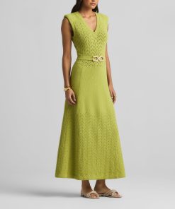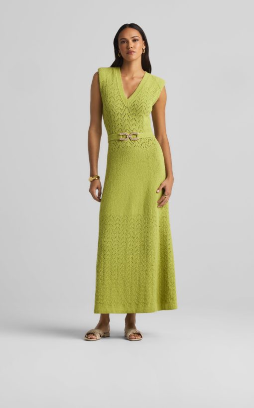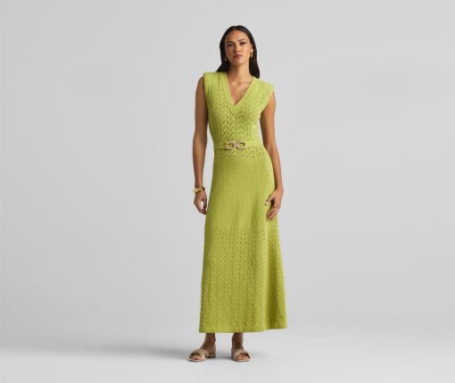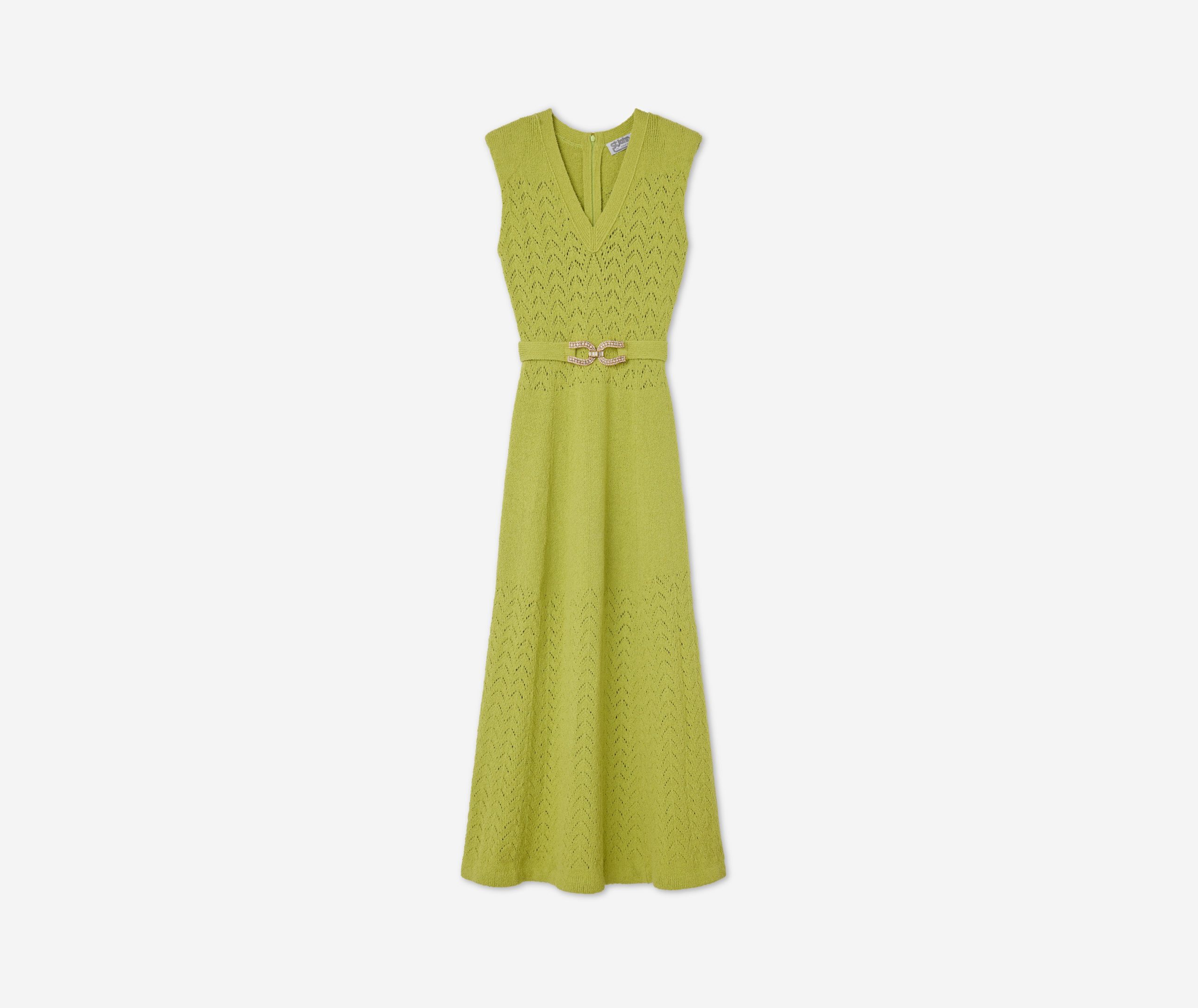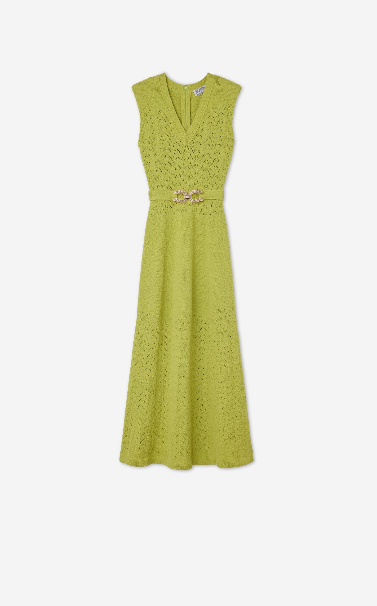 This V-neck long dress combines panels of open chevron and solid textured knits, featuring a tonal jeweled belt at the natural waist.This style is part of the Spring 2025 Re-Edition Capsule, reimagining Marie Gray’s archival designs. Each piece features a vintage logo tag, marking it as a unique collectible.All Sales are Final. No Returns or Exchanges.