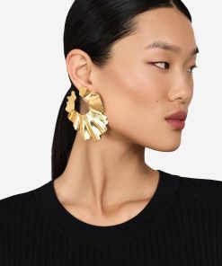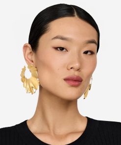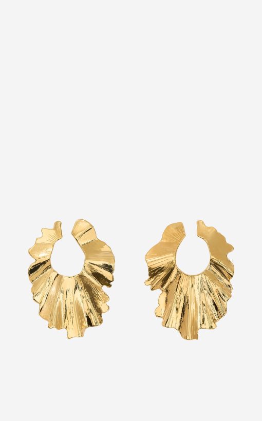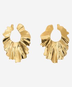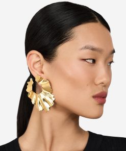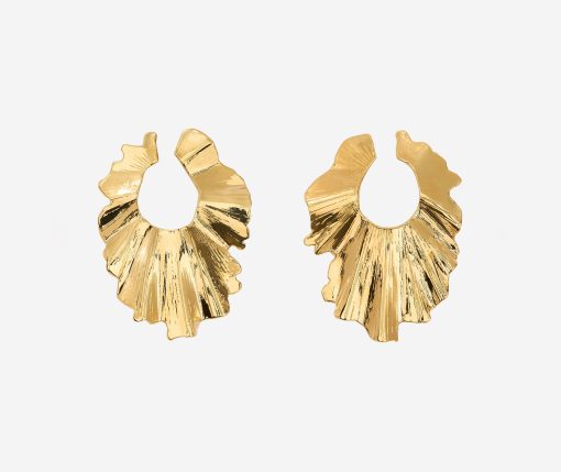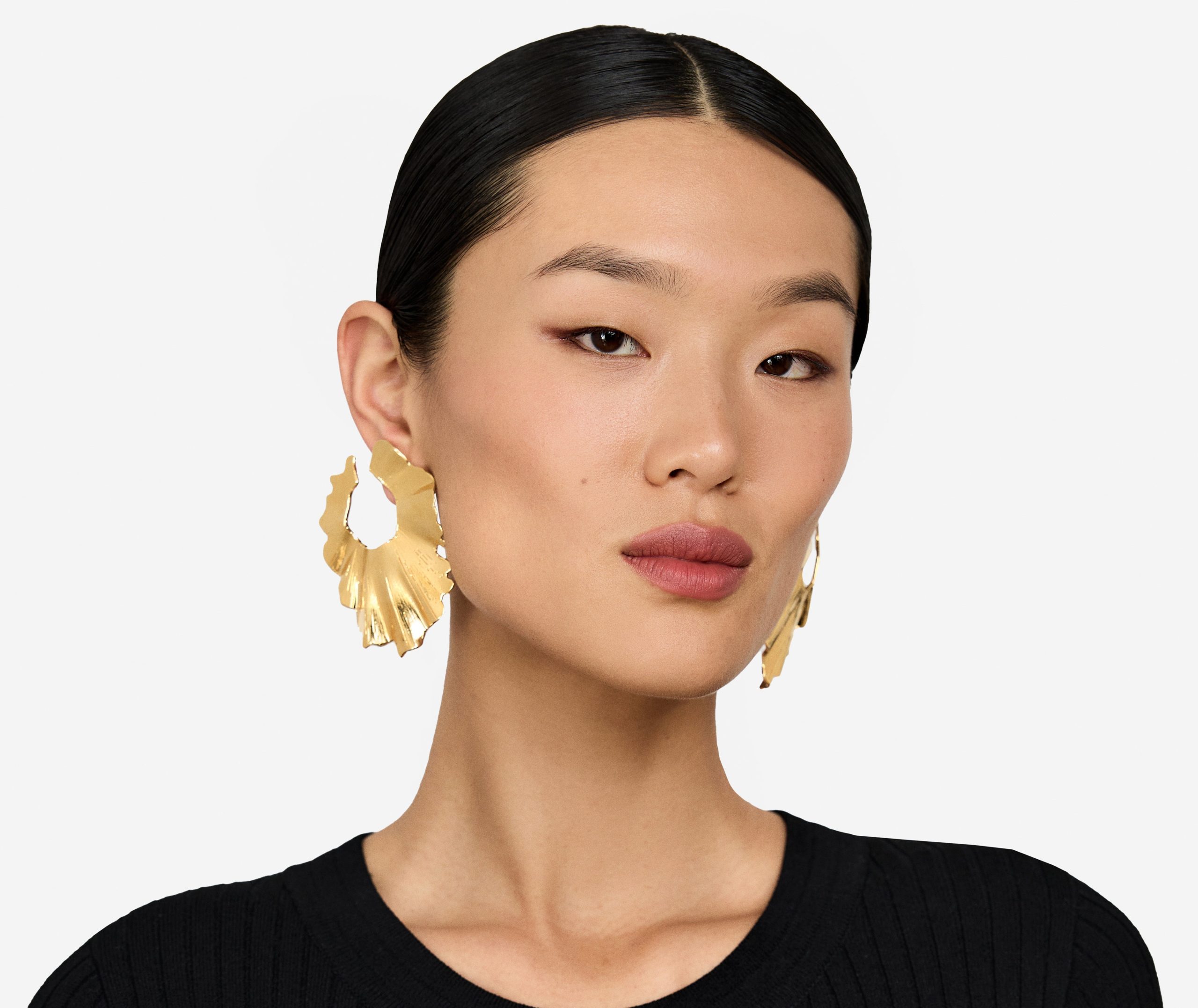 These hand-sculpted, palm leaf inspired earrings define wearable art, as textured, oversized hoops frame the face with a glamorous golden touch.