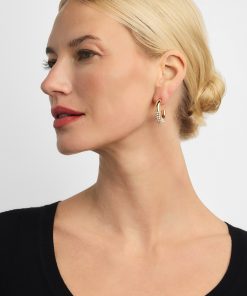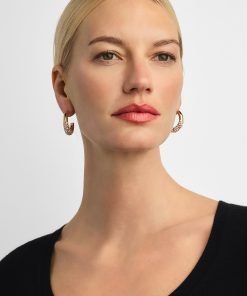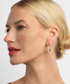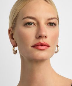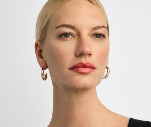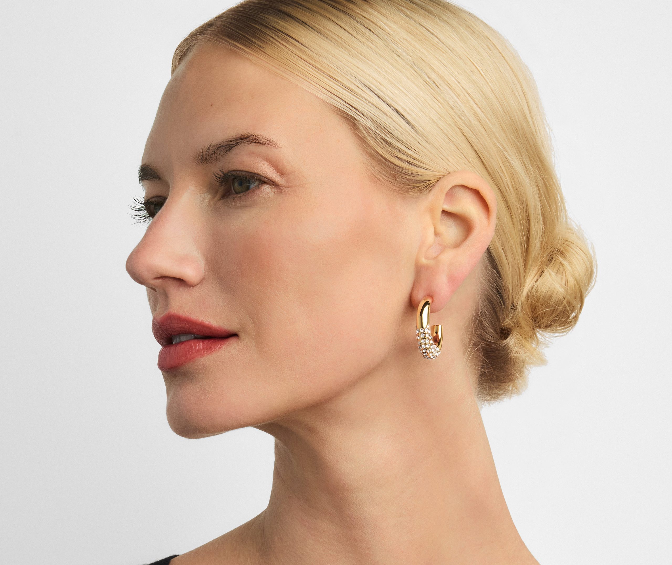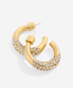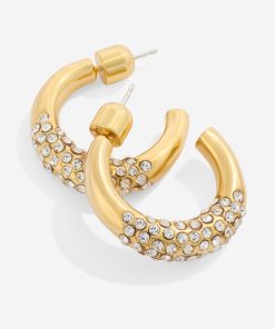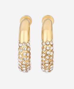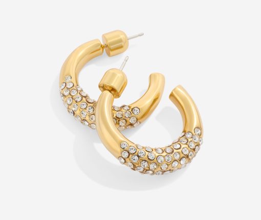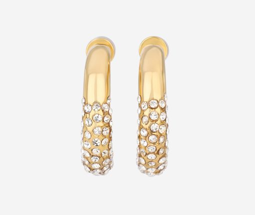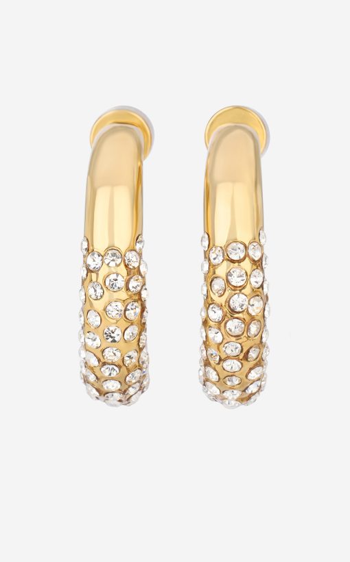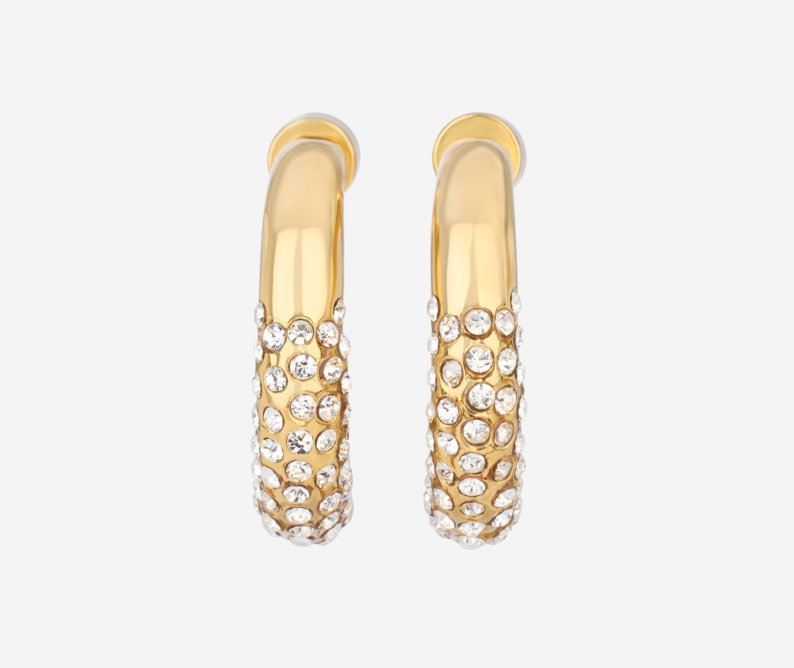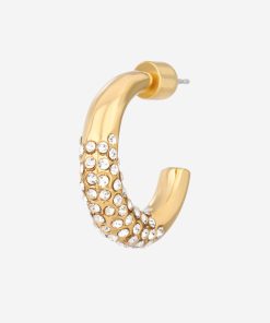 Sparkly pavé crystals decorate this tasteful gold hoop earring, adding glamour to the day or night.