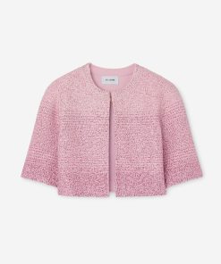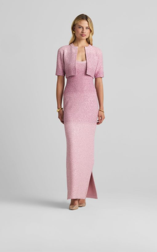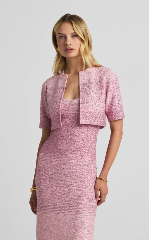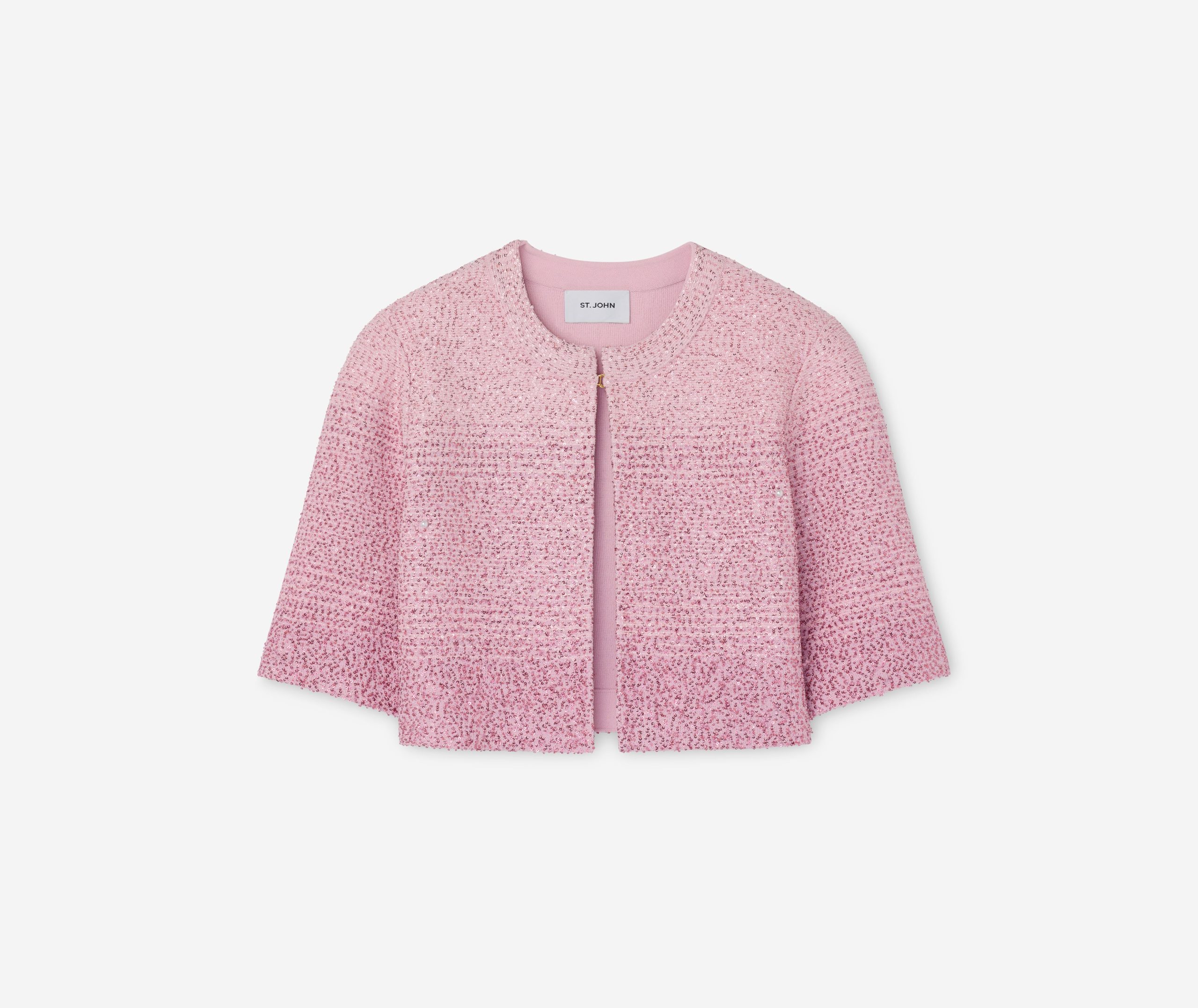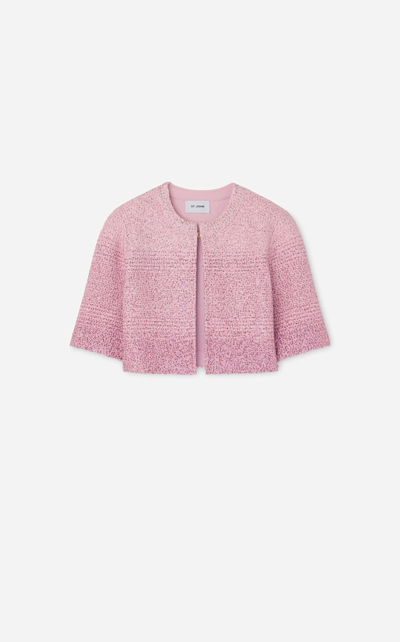 This cropped short sleeve jacket is the perfect evening topper in a simple short sleeves style with degrade sequins in a striped ombré finish.All Sales are Final. No Returns or Exchanges.