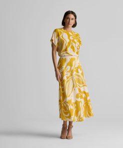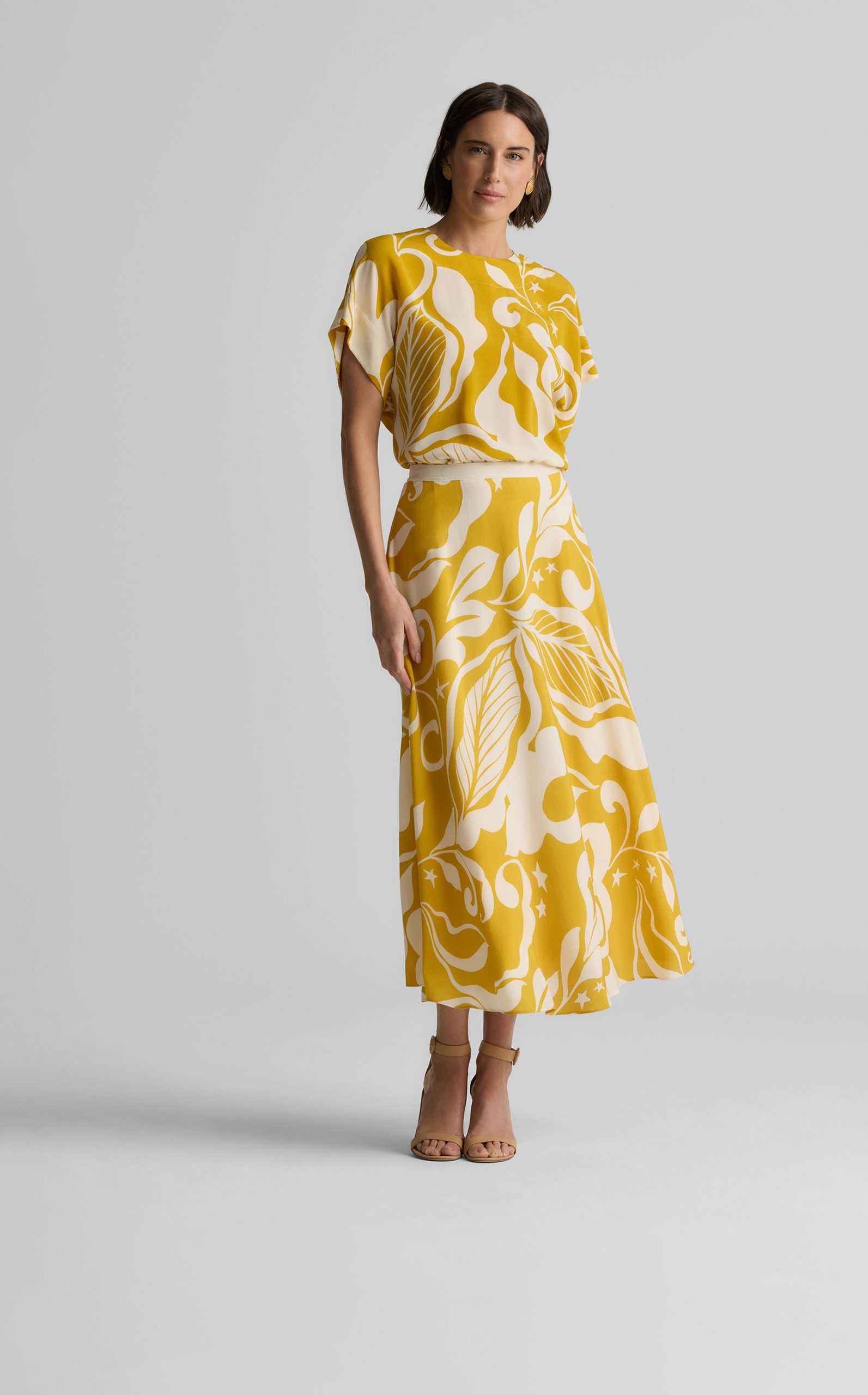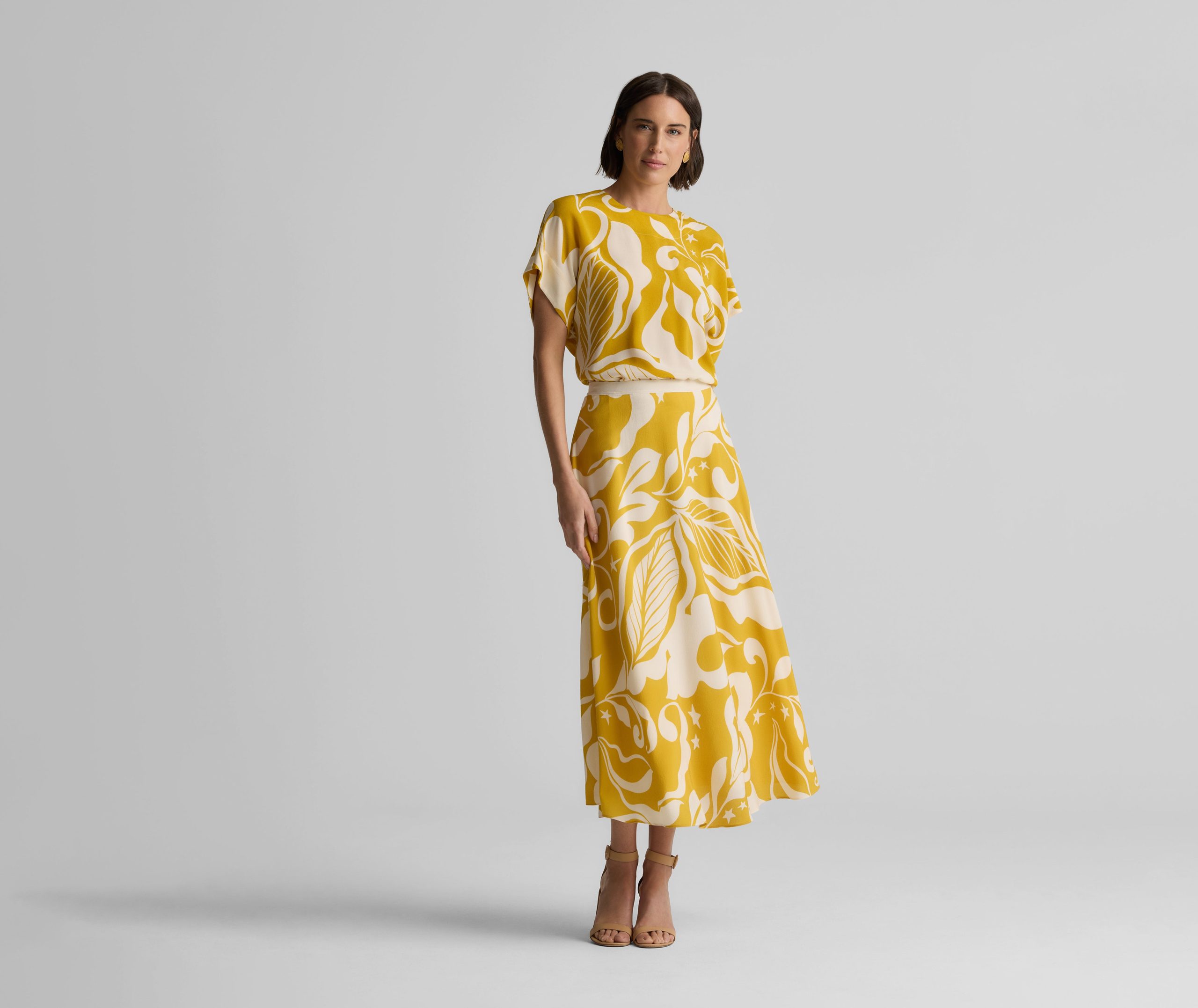 With its dynamic leaf print and airy, midi-length silhouette, the Eden in brilliant Ecru and Goldenrod makes a confident statement however it’s styled. For playful polish, pair this playful skirt with the matching Joan Top, or mix and match with your favorite separates—from blazers to blouses and tees—for endless wardrobe versatility.