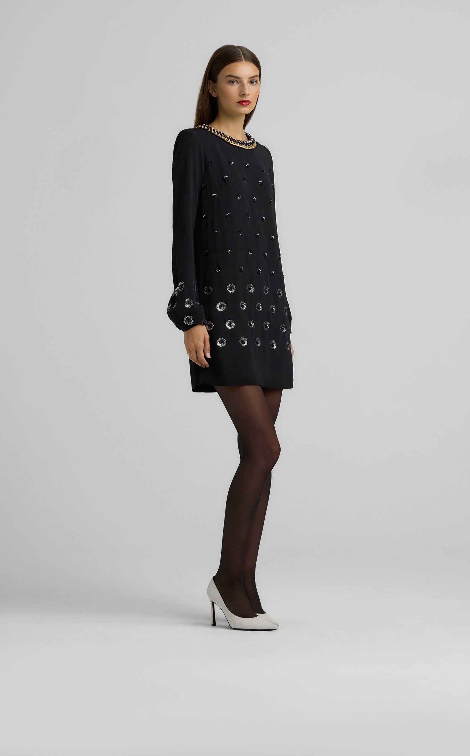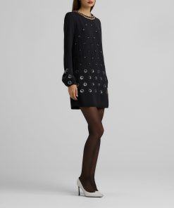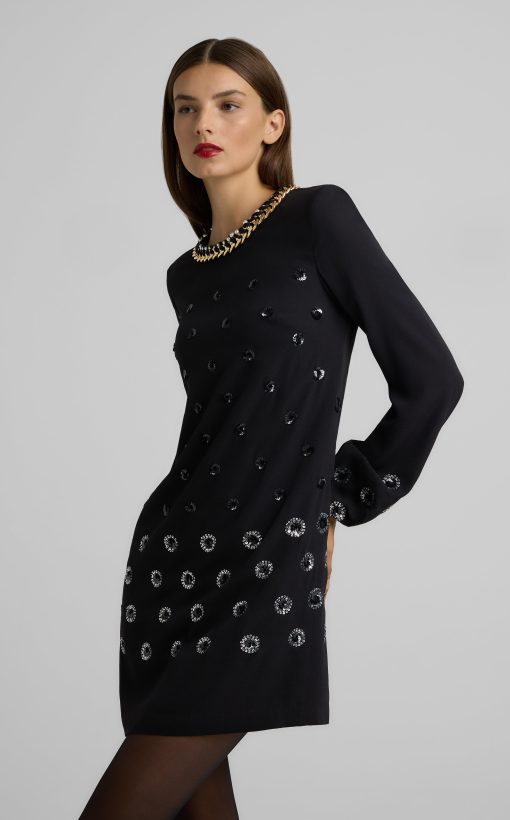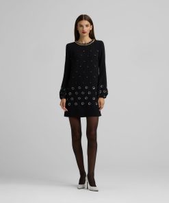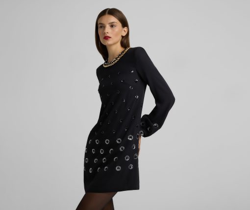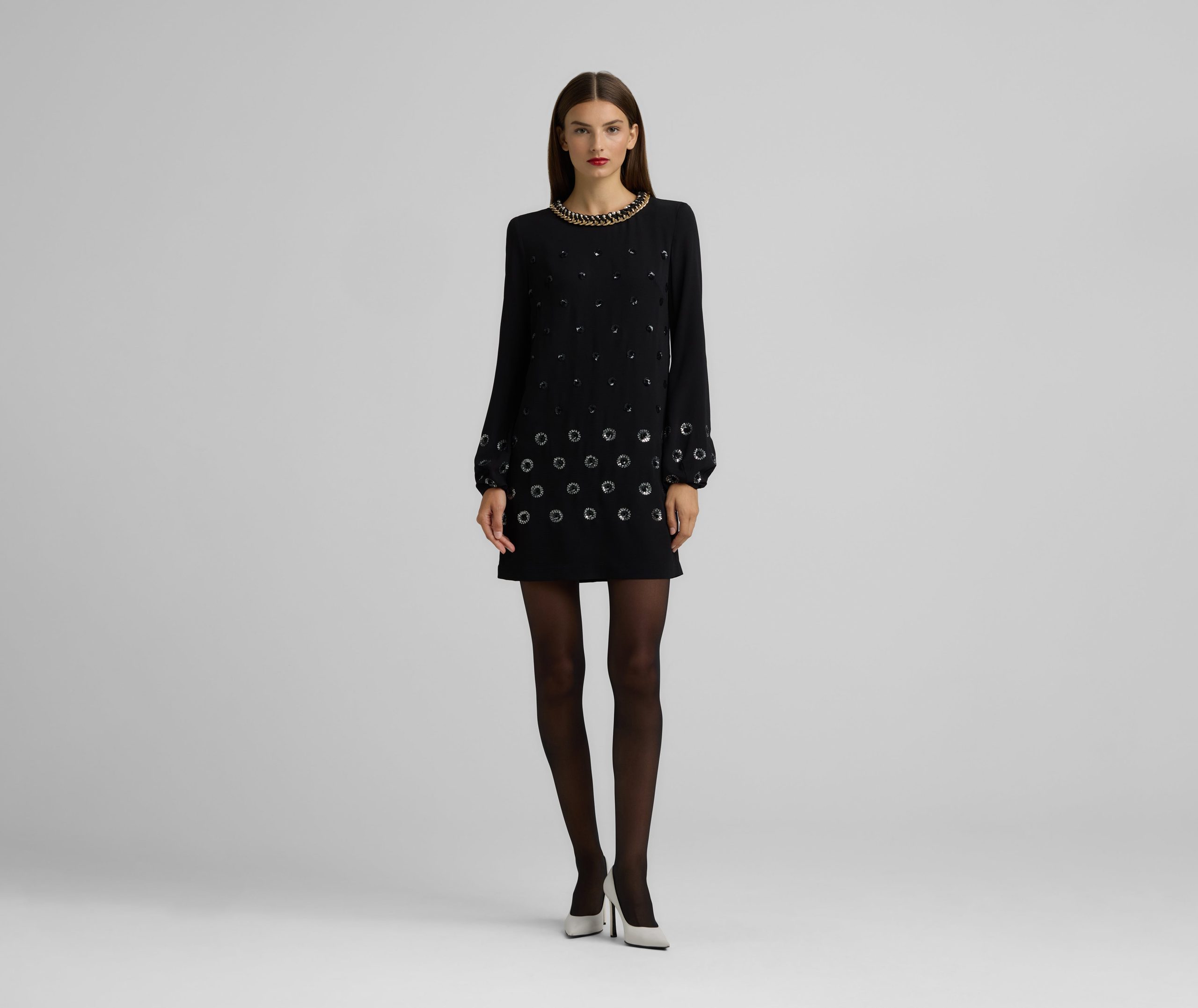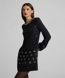This long sleeve knit dress features a chain neckline and polka dot-inspired embellishments that start as tonal touches and ease into maximum sparkle.All Sales are Final. No Returns or Exchanges.