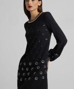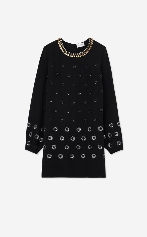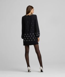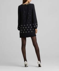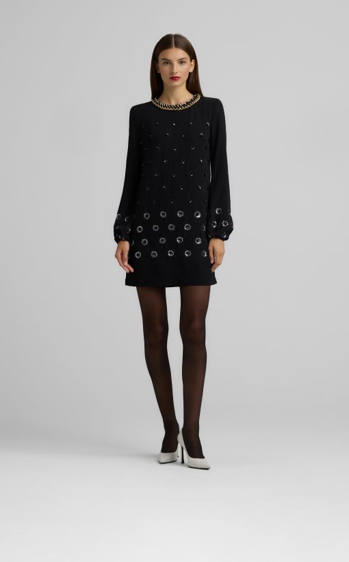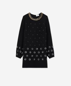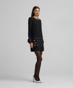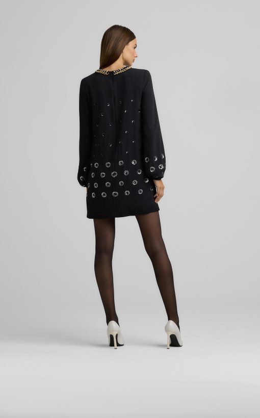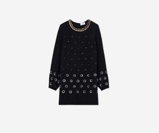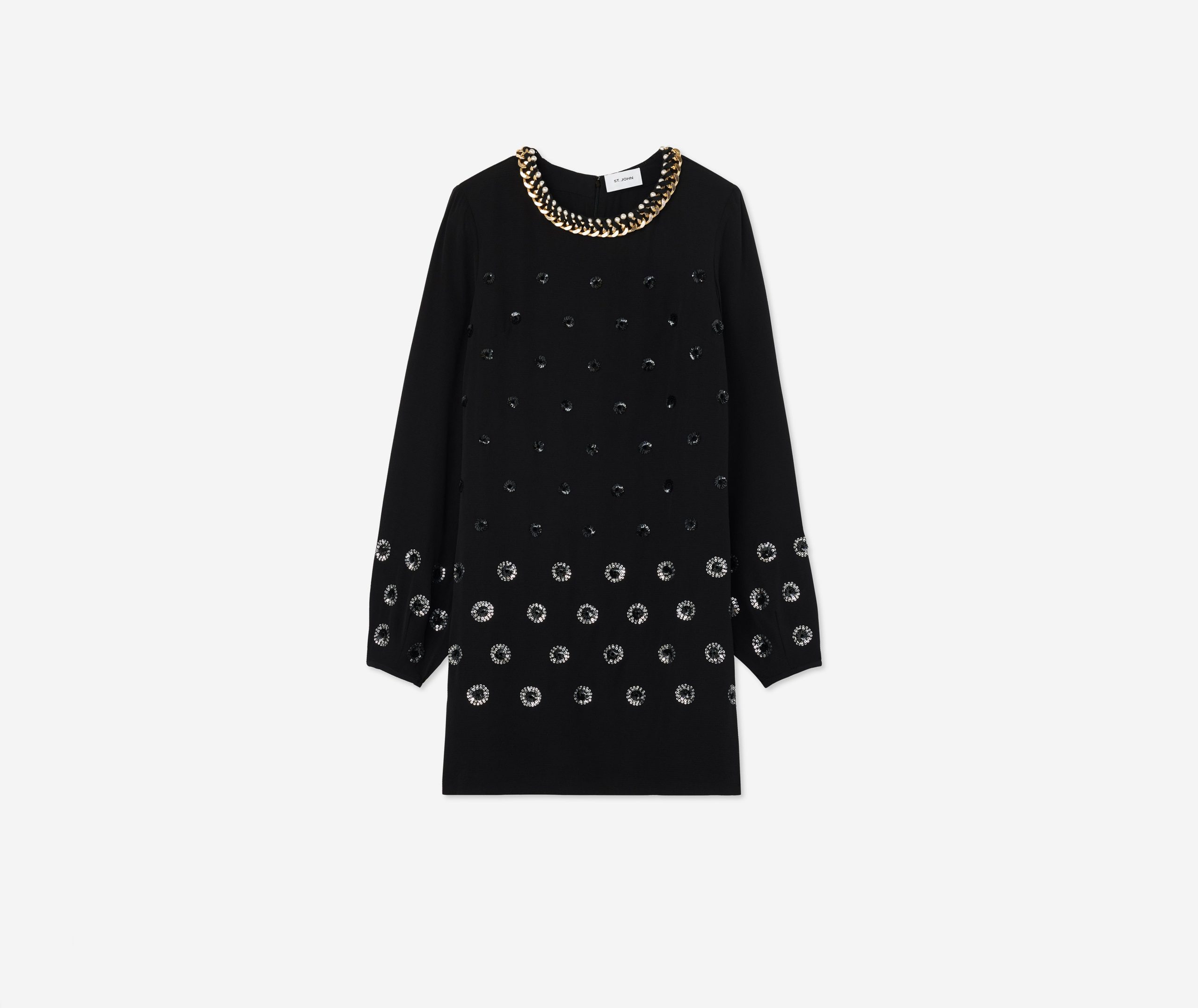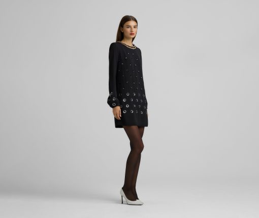 This long sleeve knit dress features a chain neckline and polka dot-inspired embellishments that start as tonal touches and ease into maximum sparkle.All Sales are Final. No Returns or Exchanges.
