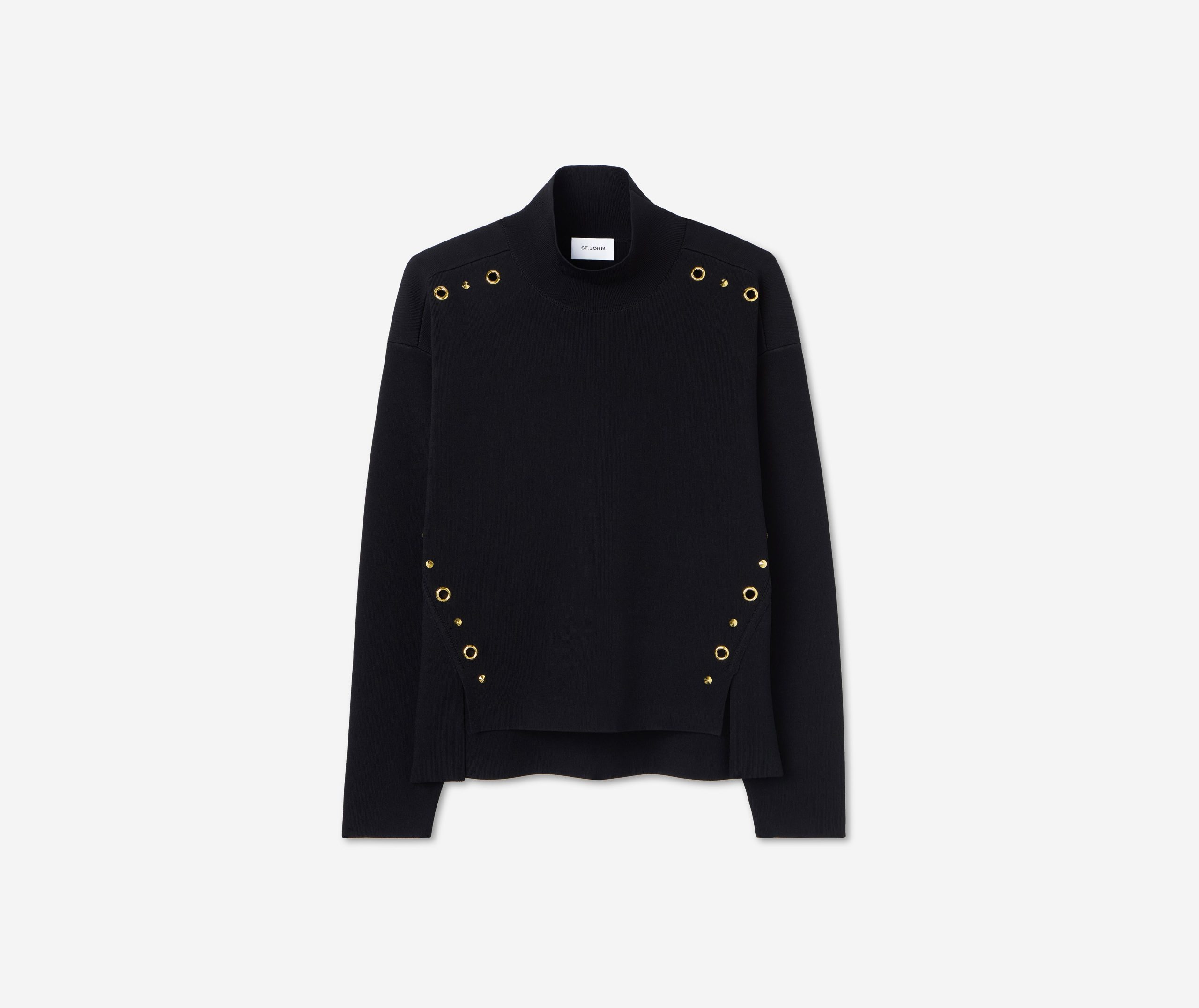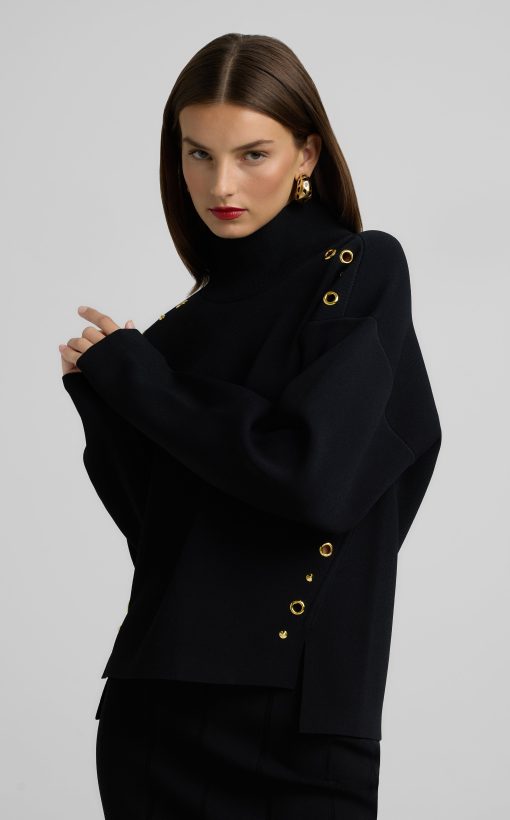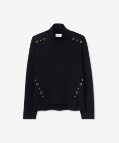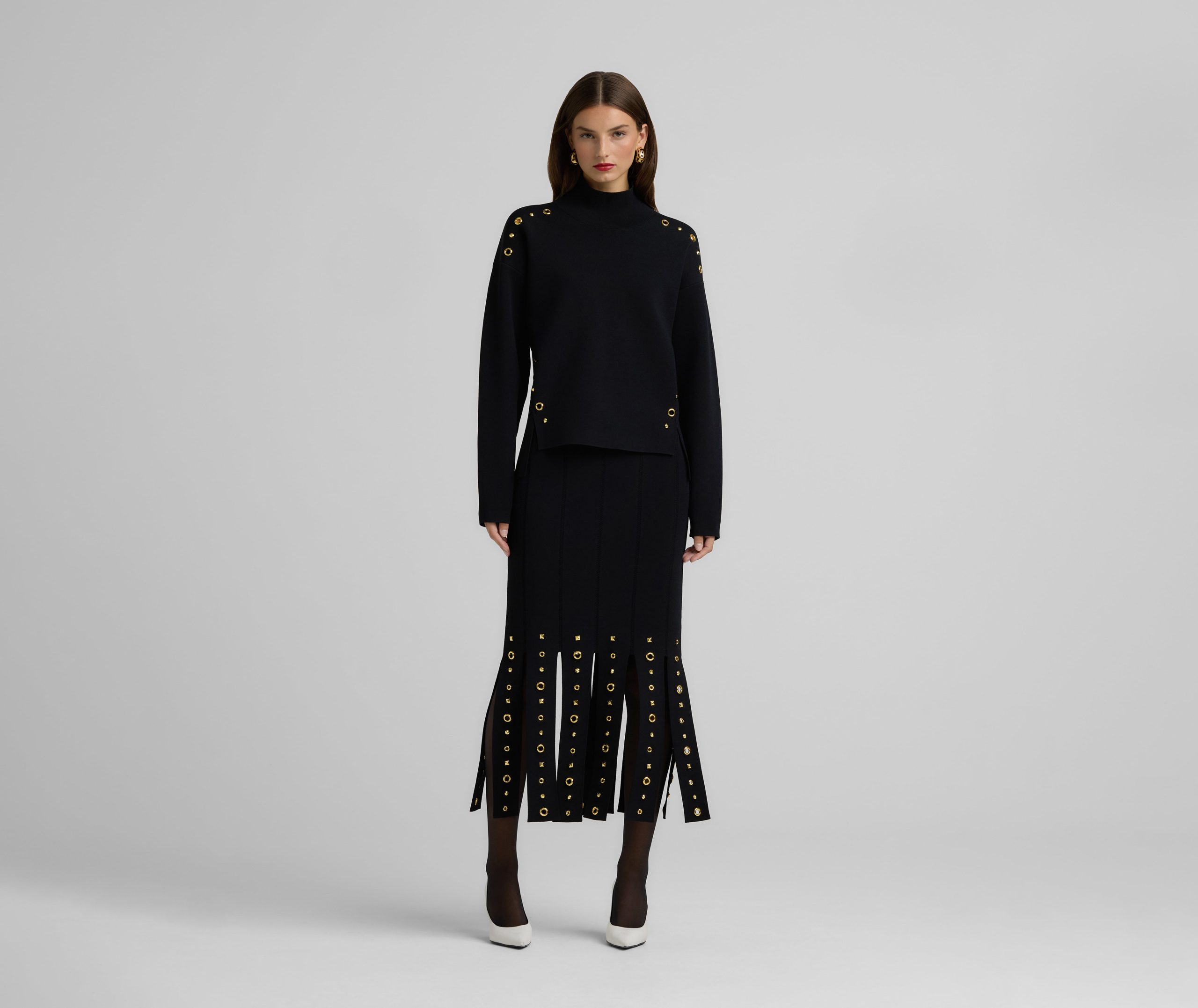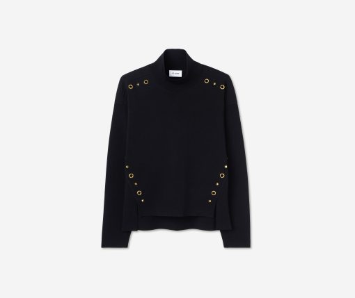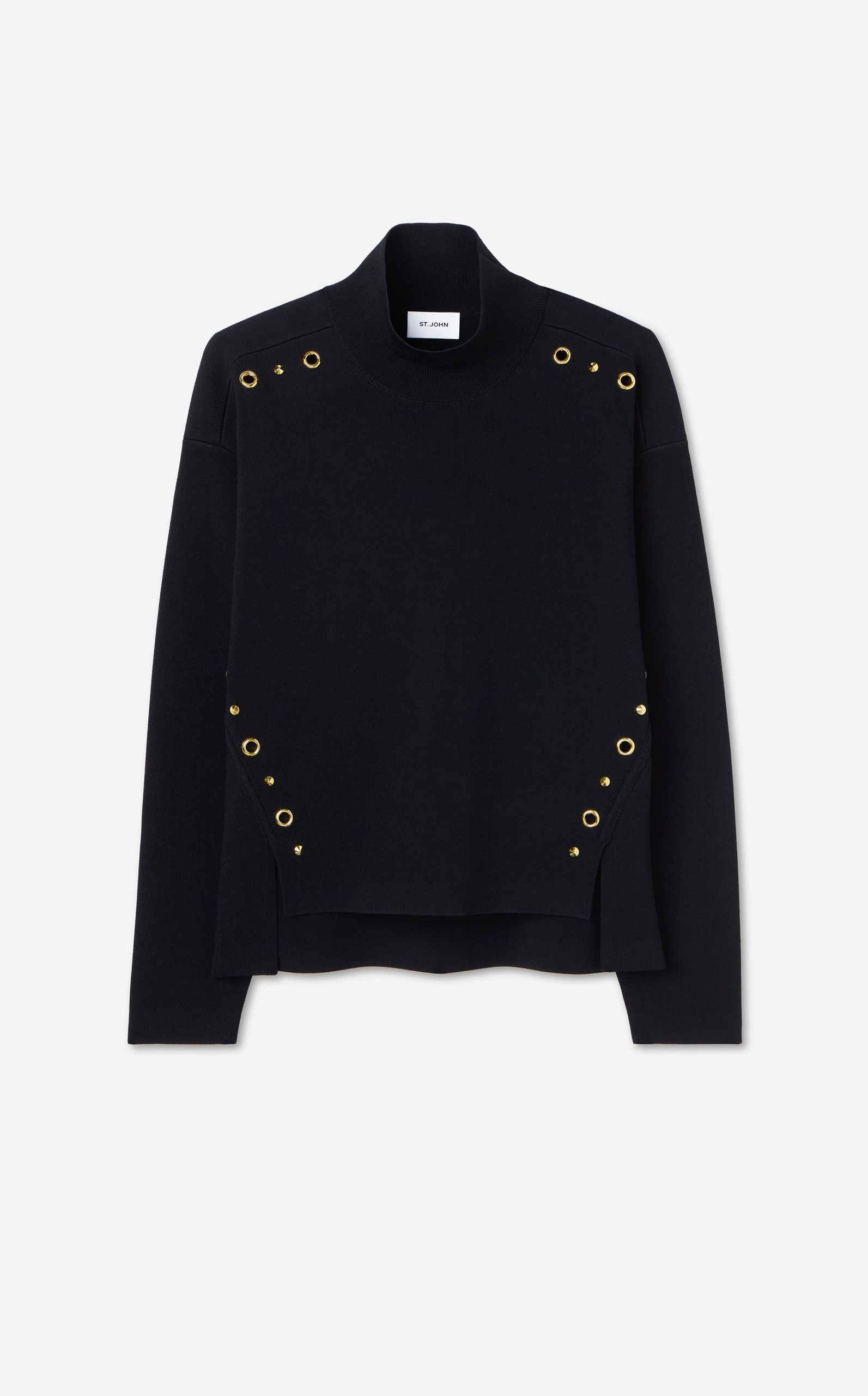 A sophisticated mock neck sweater is studded with shiny golden grommets for a high fashion touch, while slight side slits make for the perfect fit.All Sales are Final. No Returns or Exchanges.
