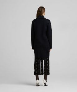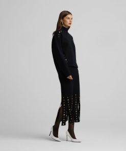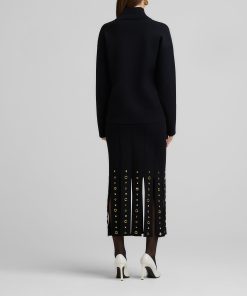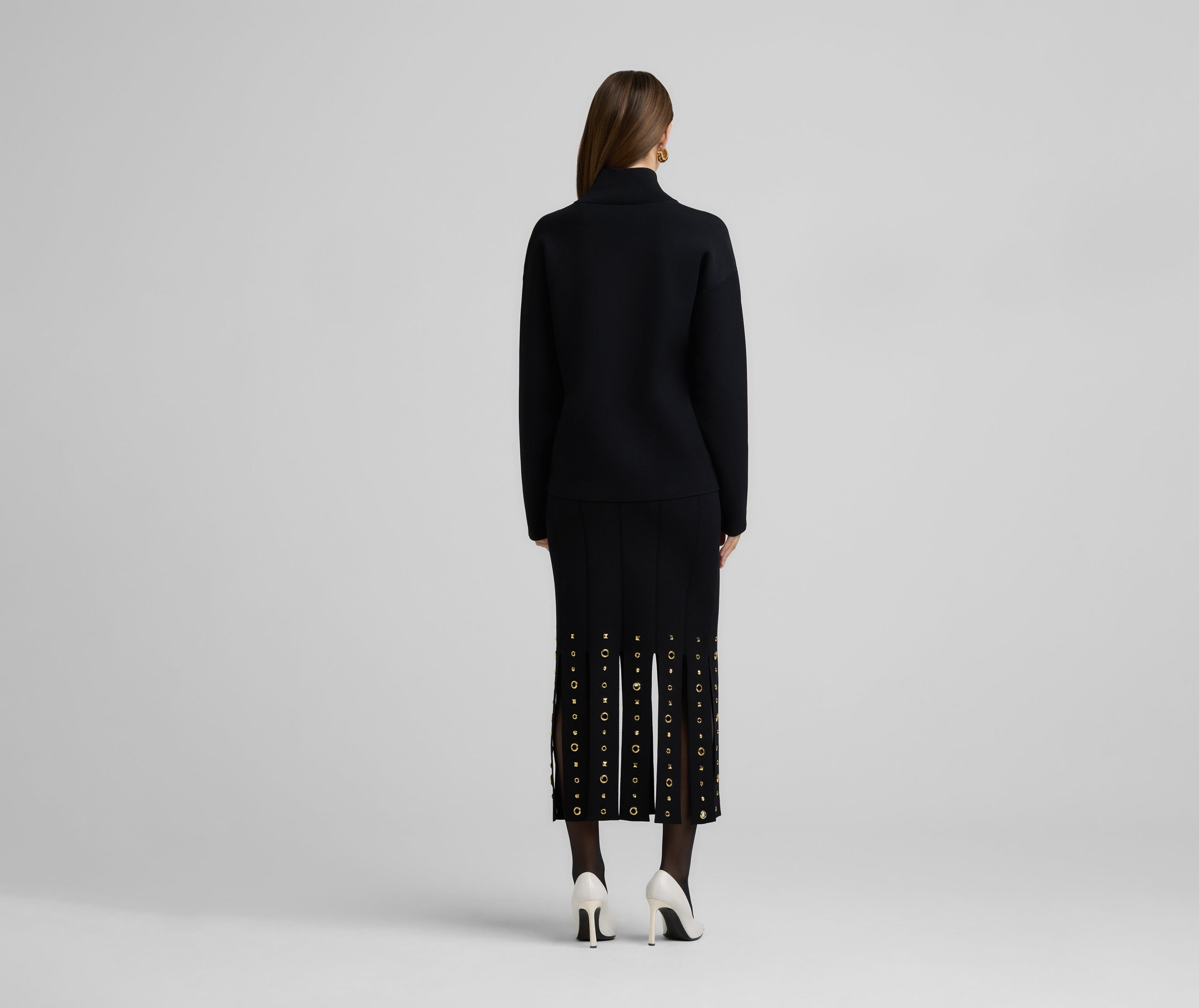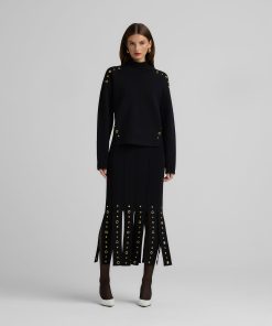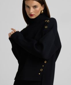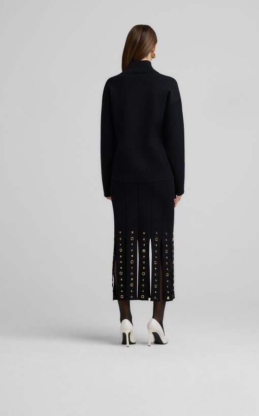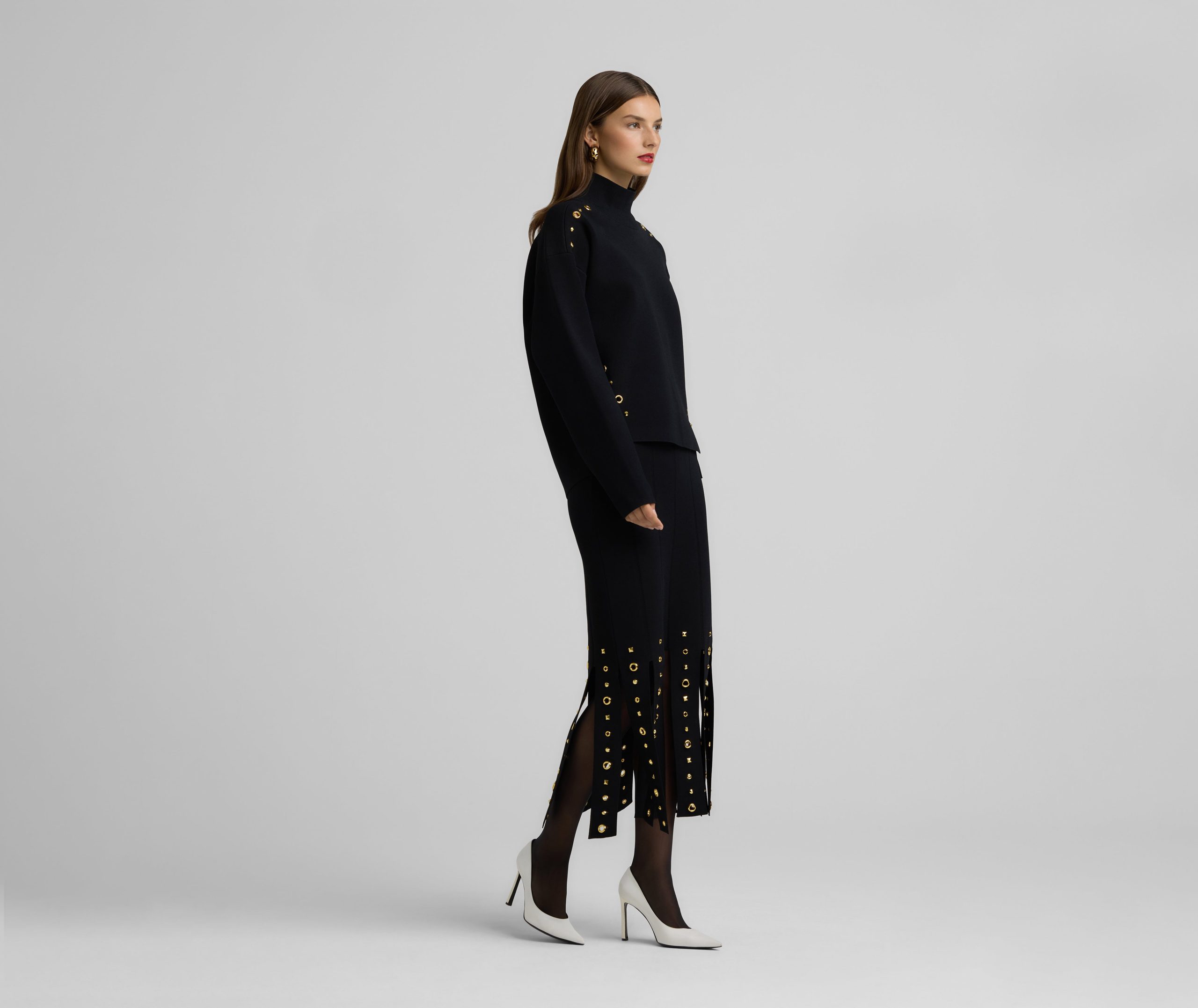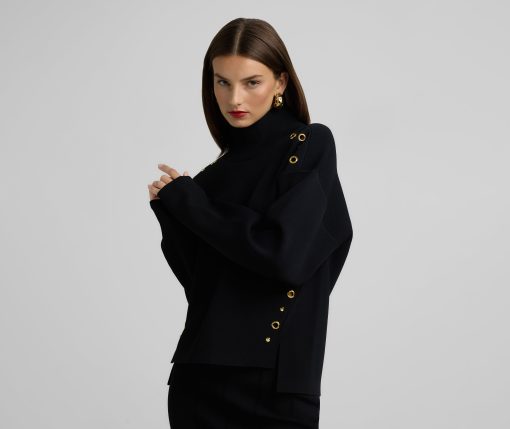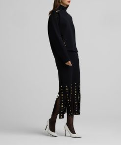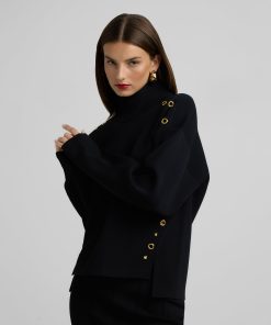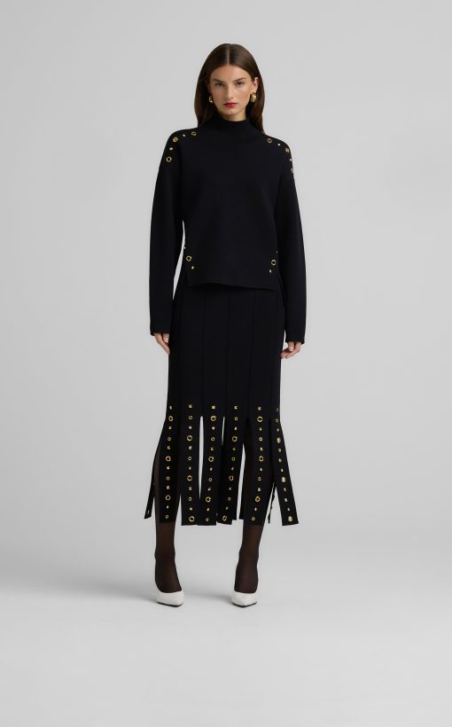 A sophisticated mock neck sweater is studded with shiny golden grommets for a high fashion touch, while slight side slits make for the perfect fit.All Sales are Final. No Returns or Exchanges.