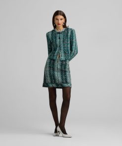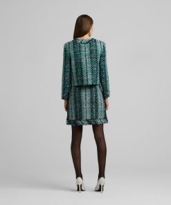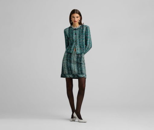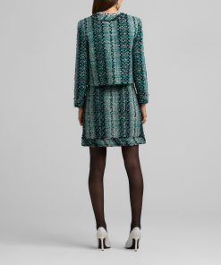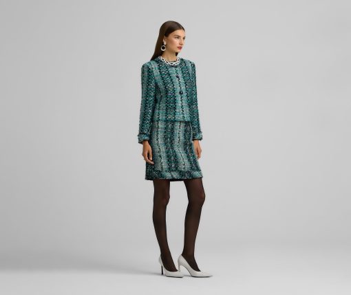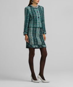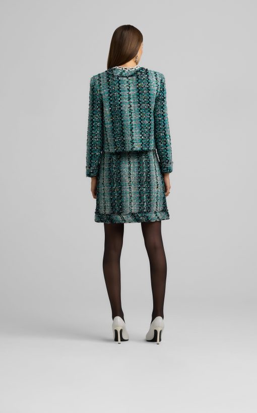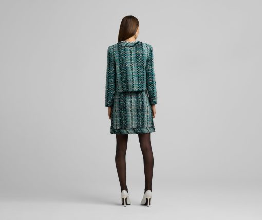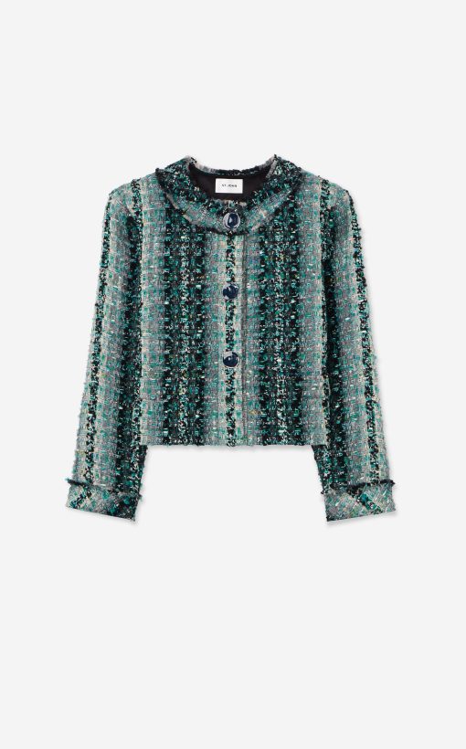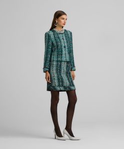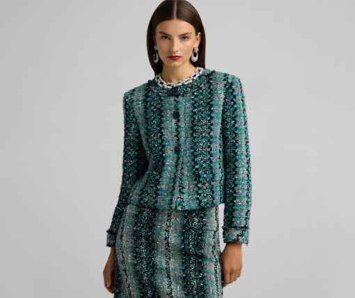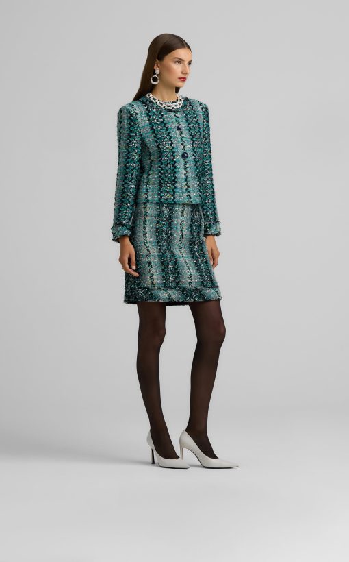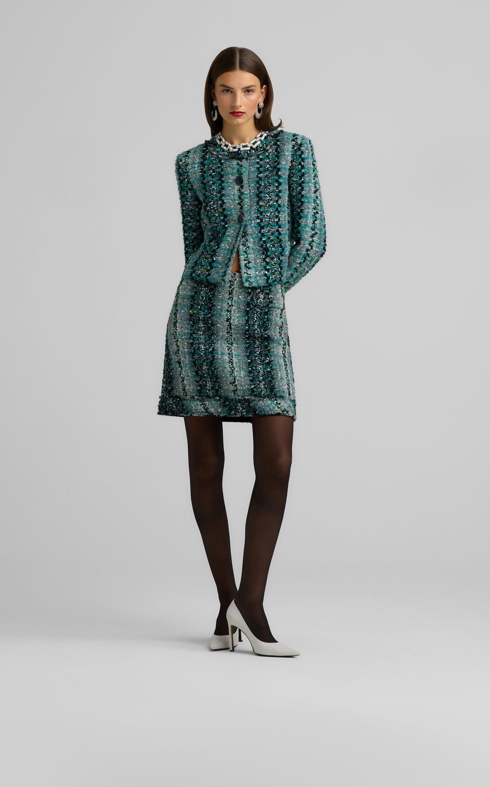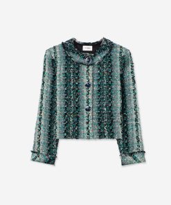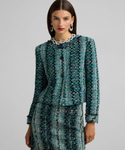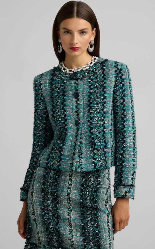 This foiled tweed jacket weaves a spectrum of shades in the most interesting knit, with flattering vertical lines and three statement buttons.All Sales are Final. No Returns or Exchanges.