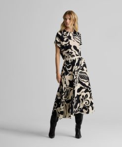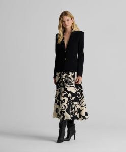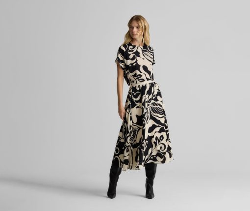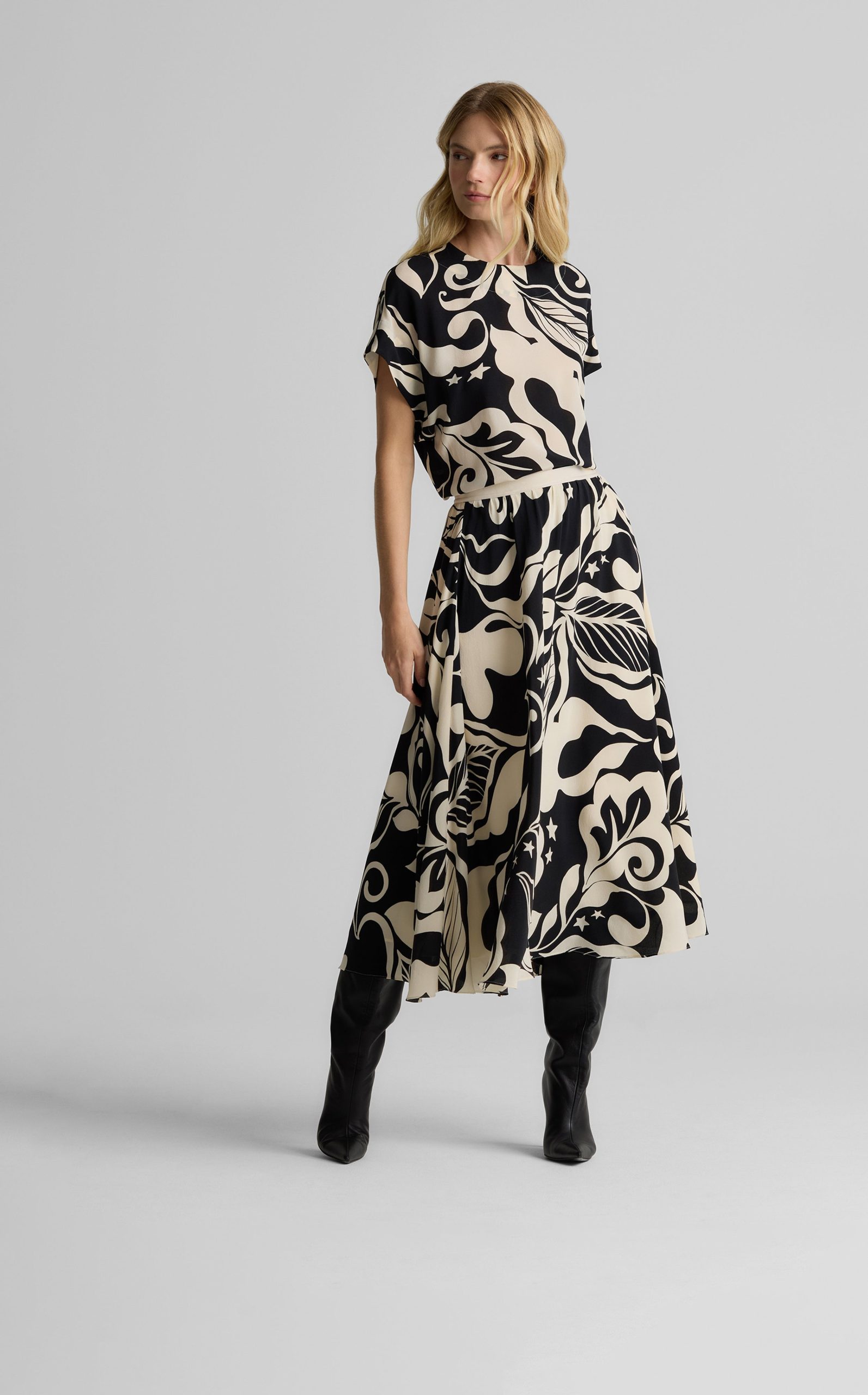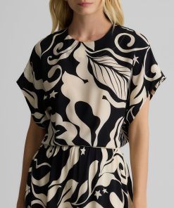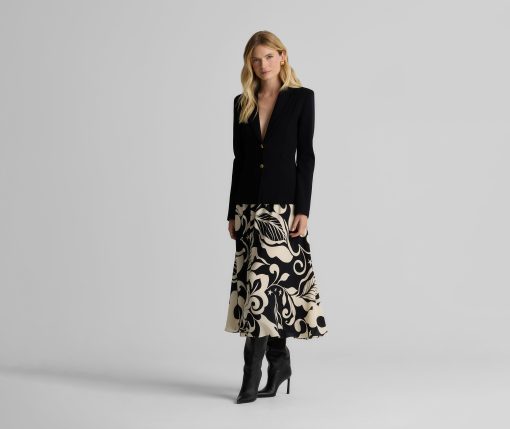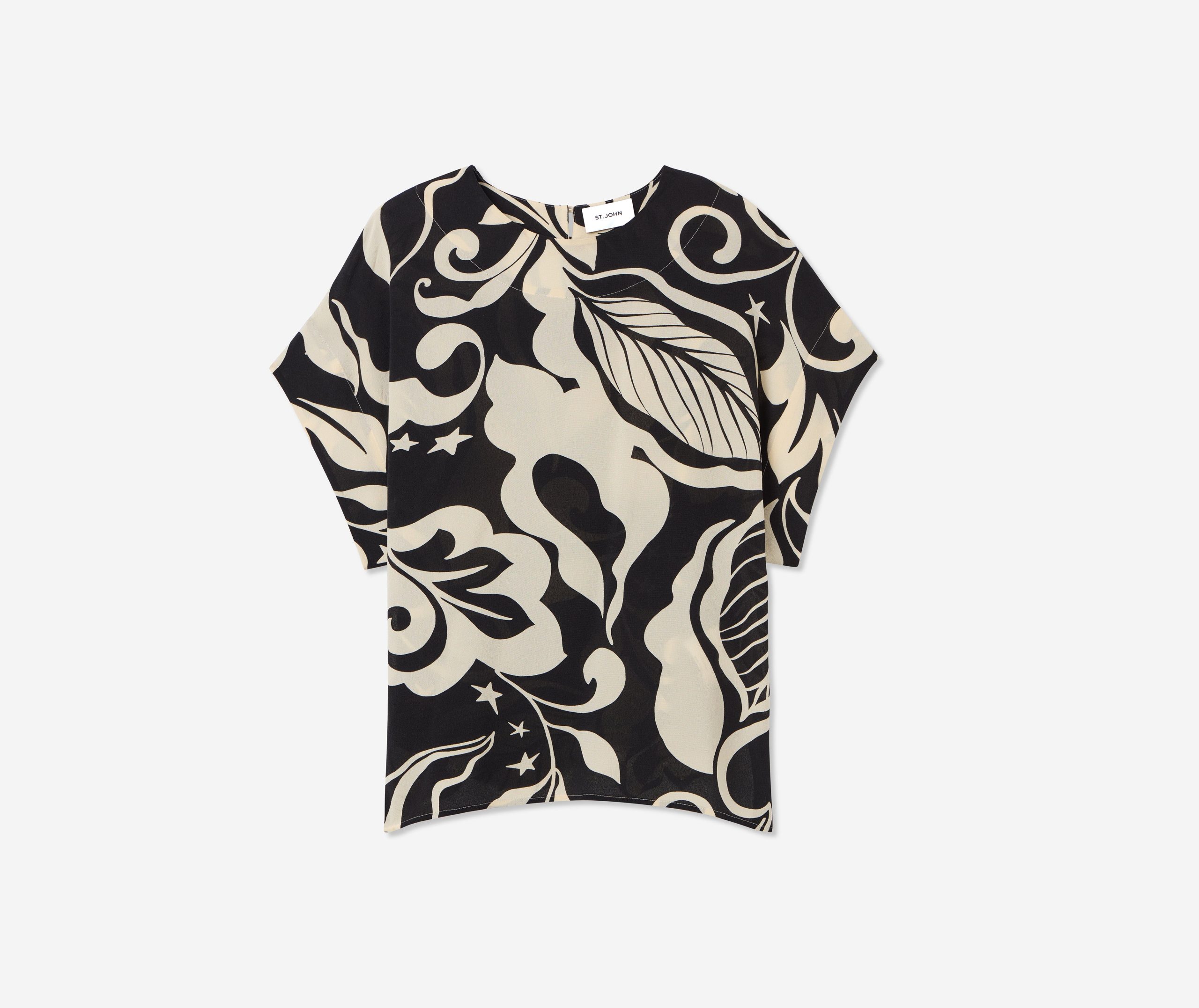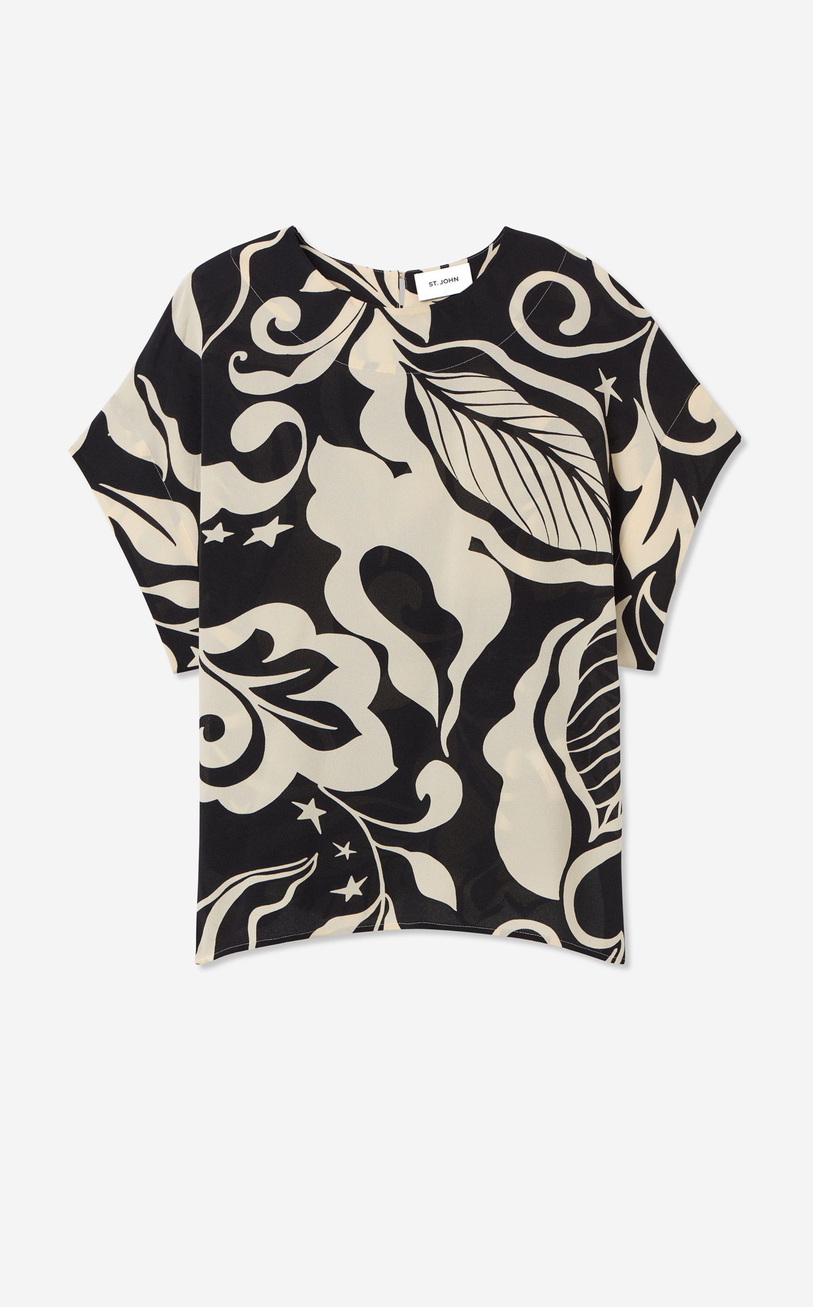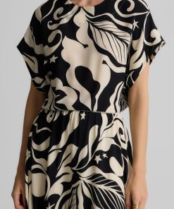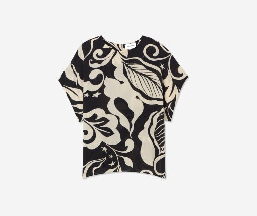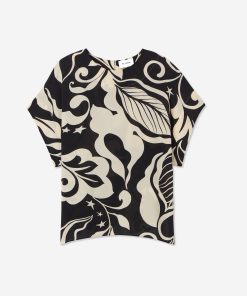 Defined by its graphic leaf print and relaxed dolman t-shirt sleeves, the Joan in classic Ecru and Black makes a splashy addition to your everyday wardrobe and dressy attire alike. Pair this airy top with the Eden Skirt for a bold, coordinated set or mix-and-match with solid separates to for a more subtle pop of pattern.
