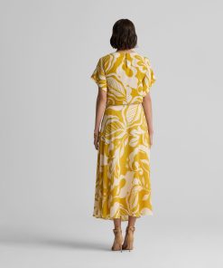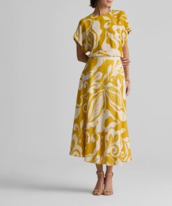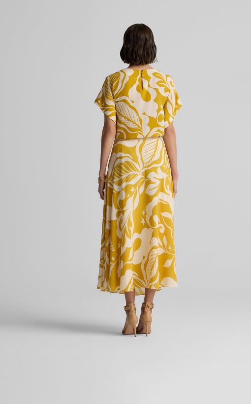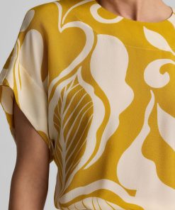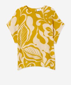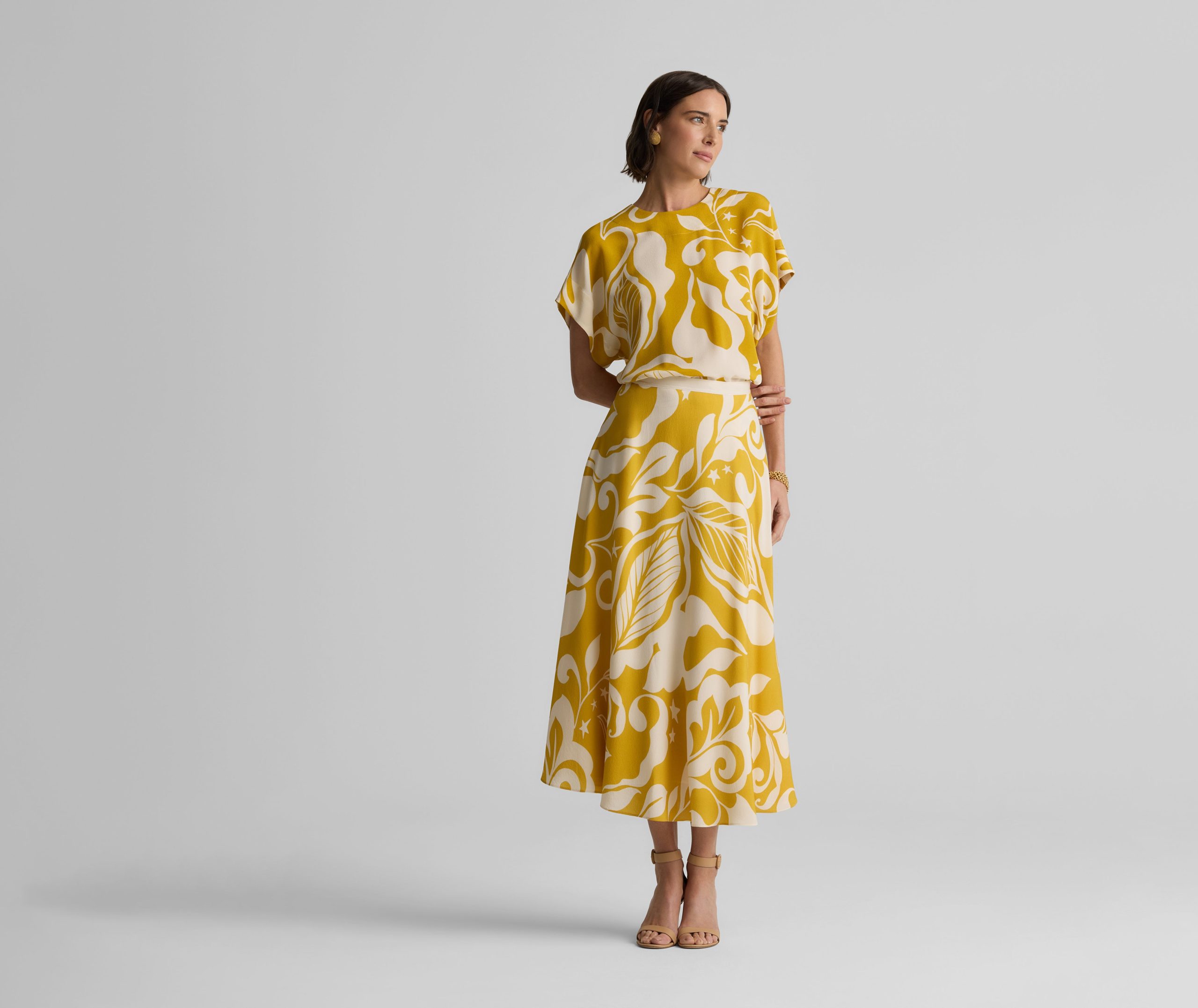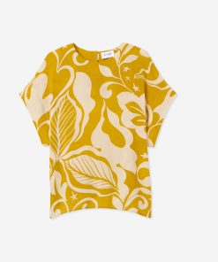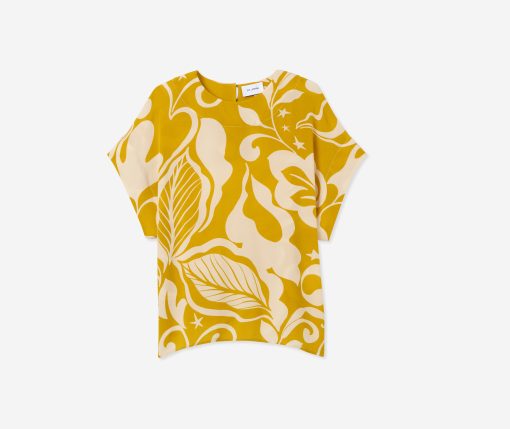 Defined by its graphic leaf print and relaxed dolman t-shirt sleeves, the Joan in brilliant Ecru and Goldenrod makes a splashy addition to your everyday wardrobe and dressy attire alike. Pair this airy top with the Eden Skirt for a bold, coordinated set or mix-and-match with solid separates to for a more subtle pop of pattern.