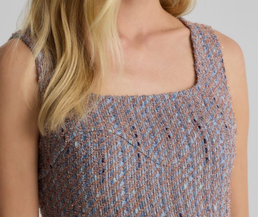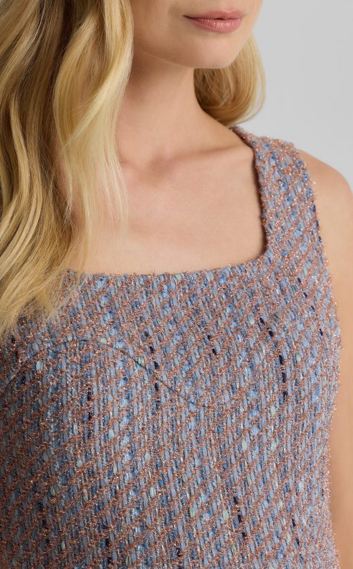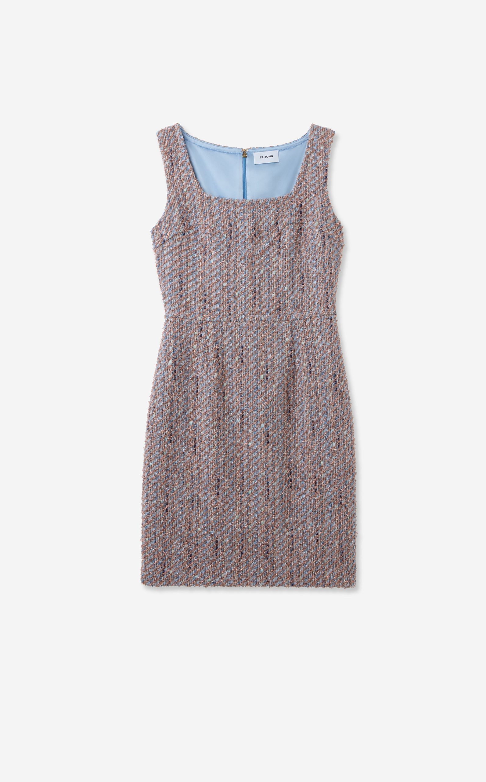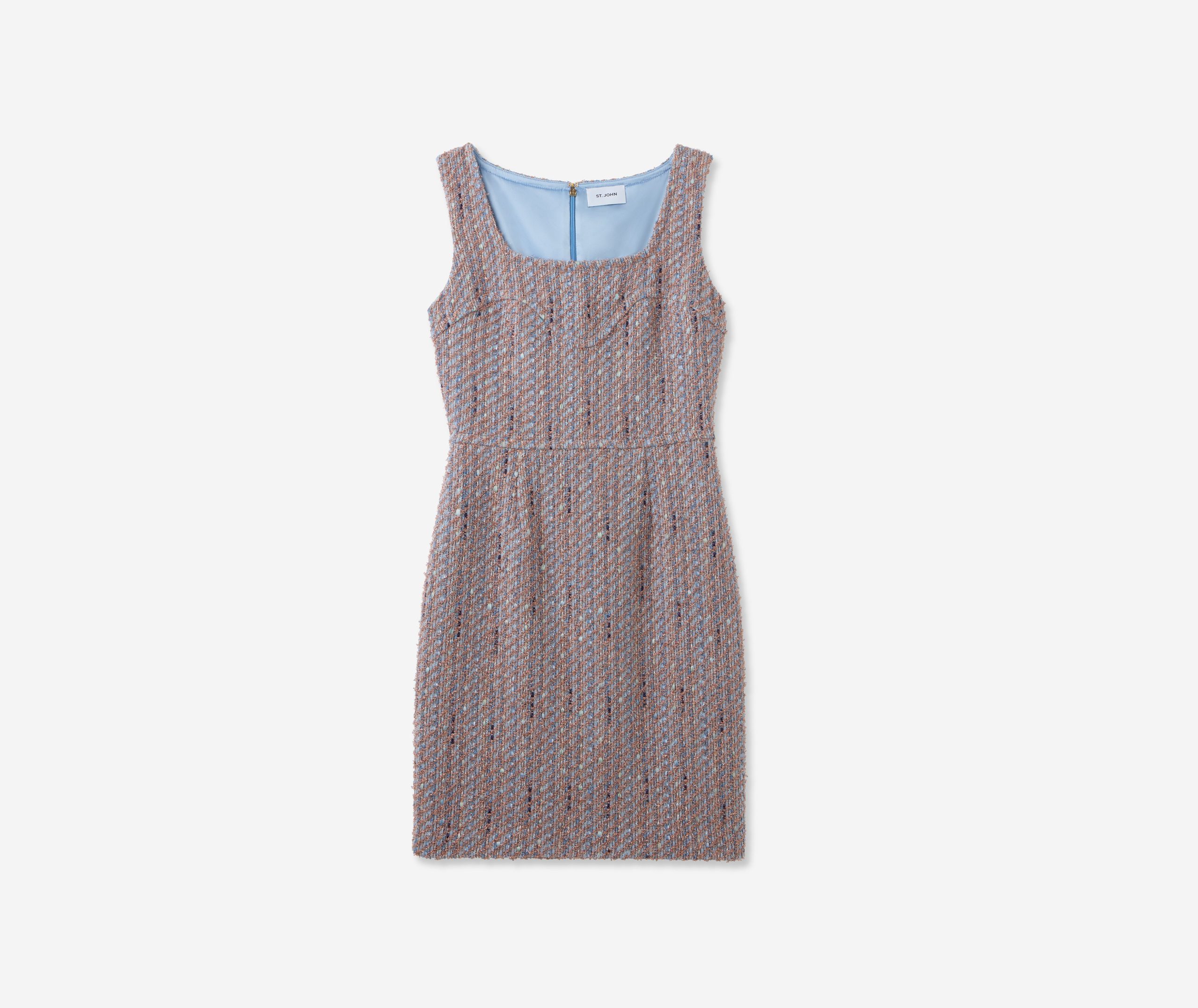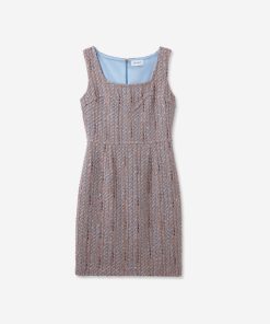How do you make a classic sleeveless sheath even more elegant? The Lena is crafted in our tasteful metallic-threaded Azure Tweed for a subtle shimmer and updated with a flattering square neckline. Worn on its own, this dress makes an undeniably chic statement, but paired with our matching Naomi Jacket it creates the most polished set.