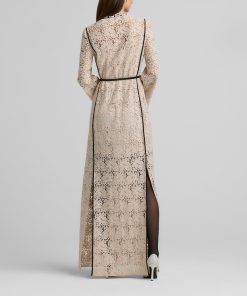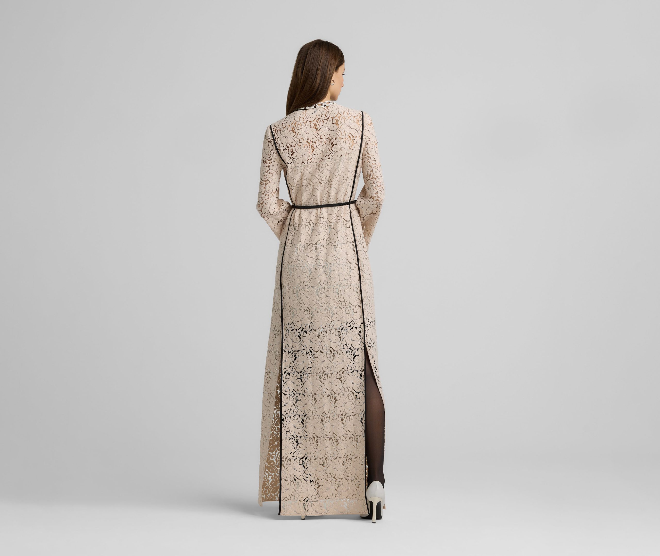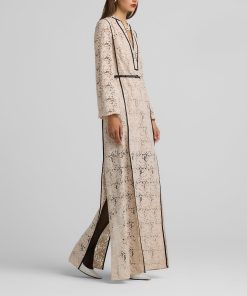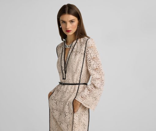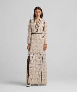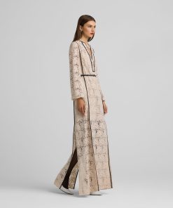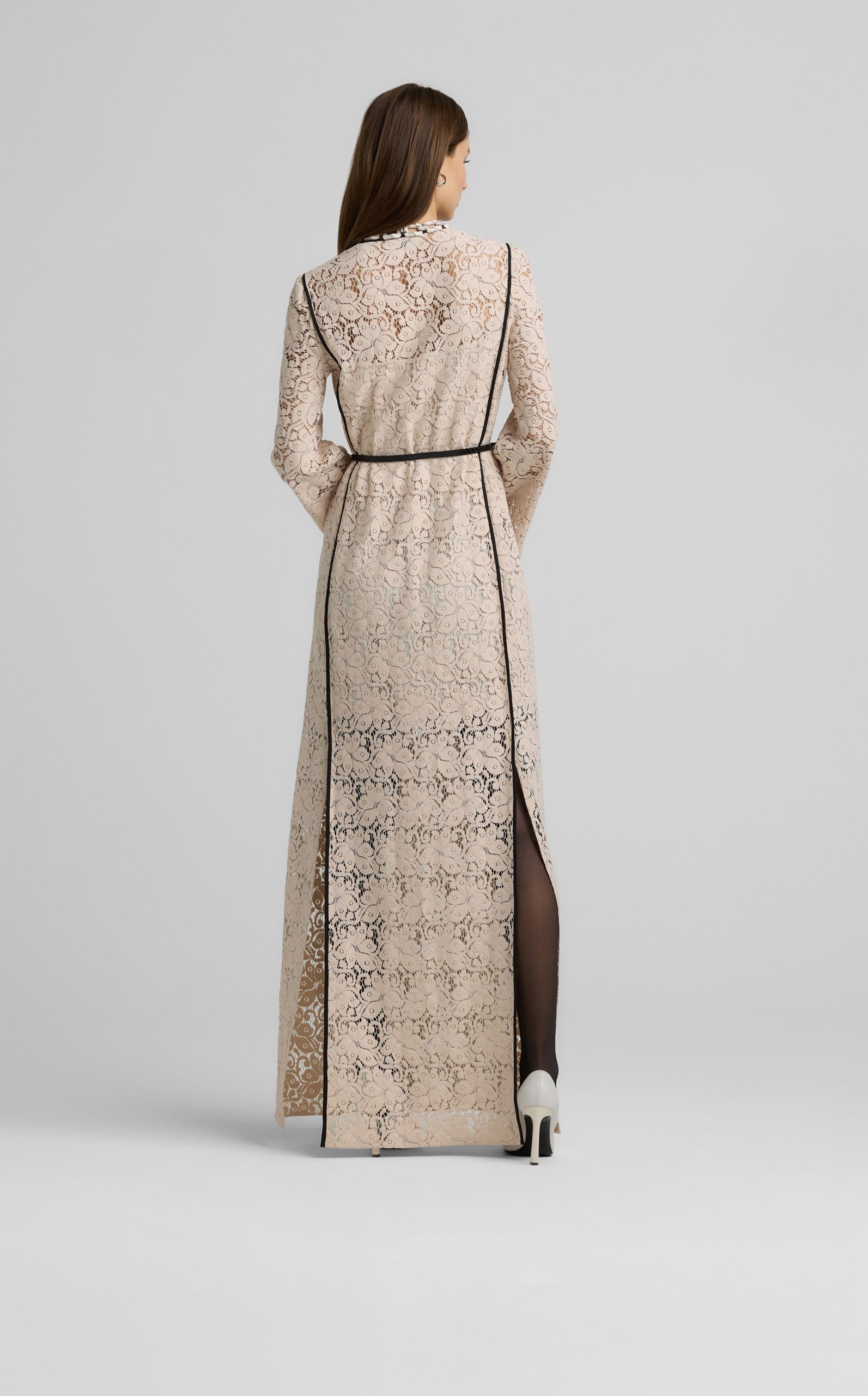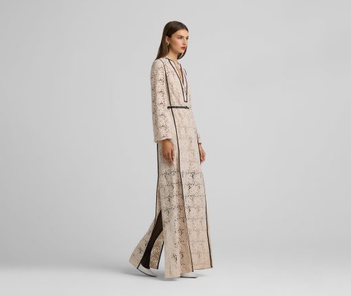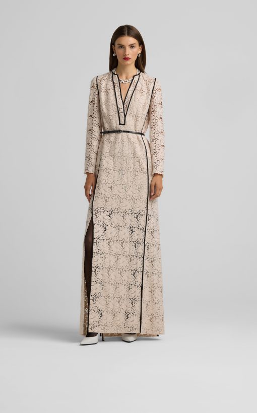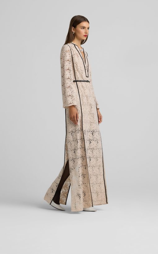 Lace takes a modern turn in cotton-blend guipure, in a long sleeve gown with contrast piping, slits, and a V-neck that bring personality to the piece.All Sales are Final. No Returns or Exchanges.