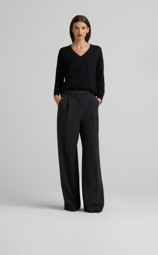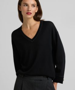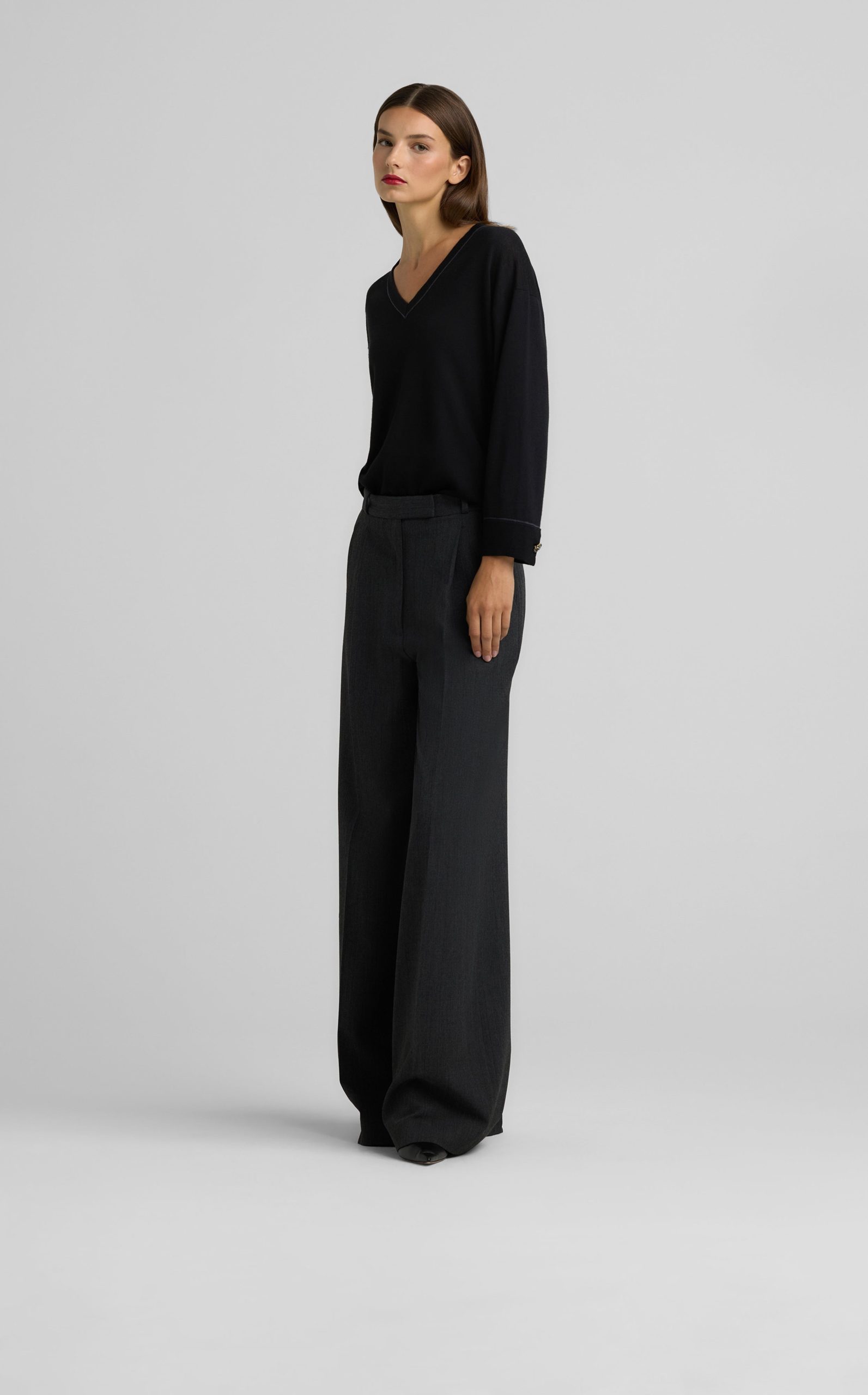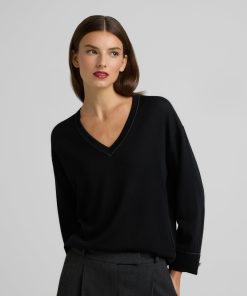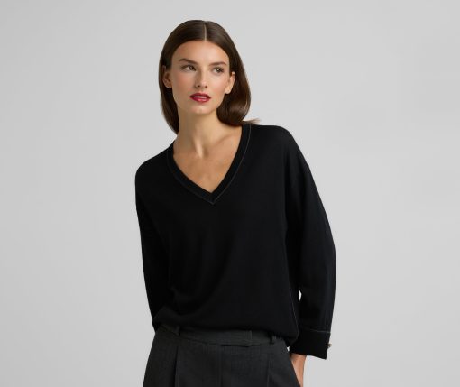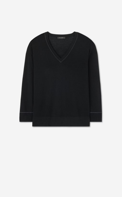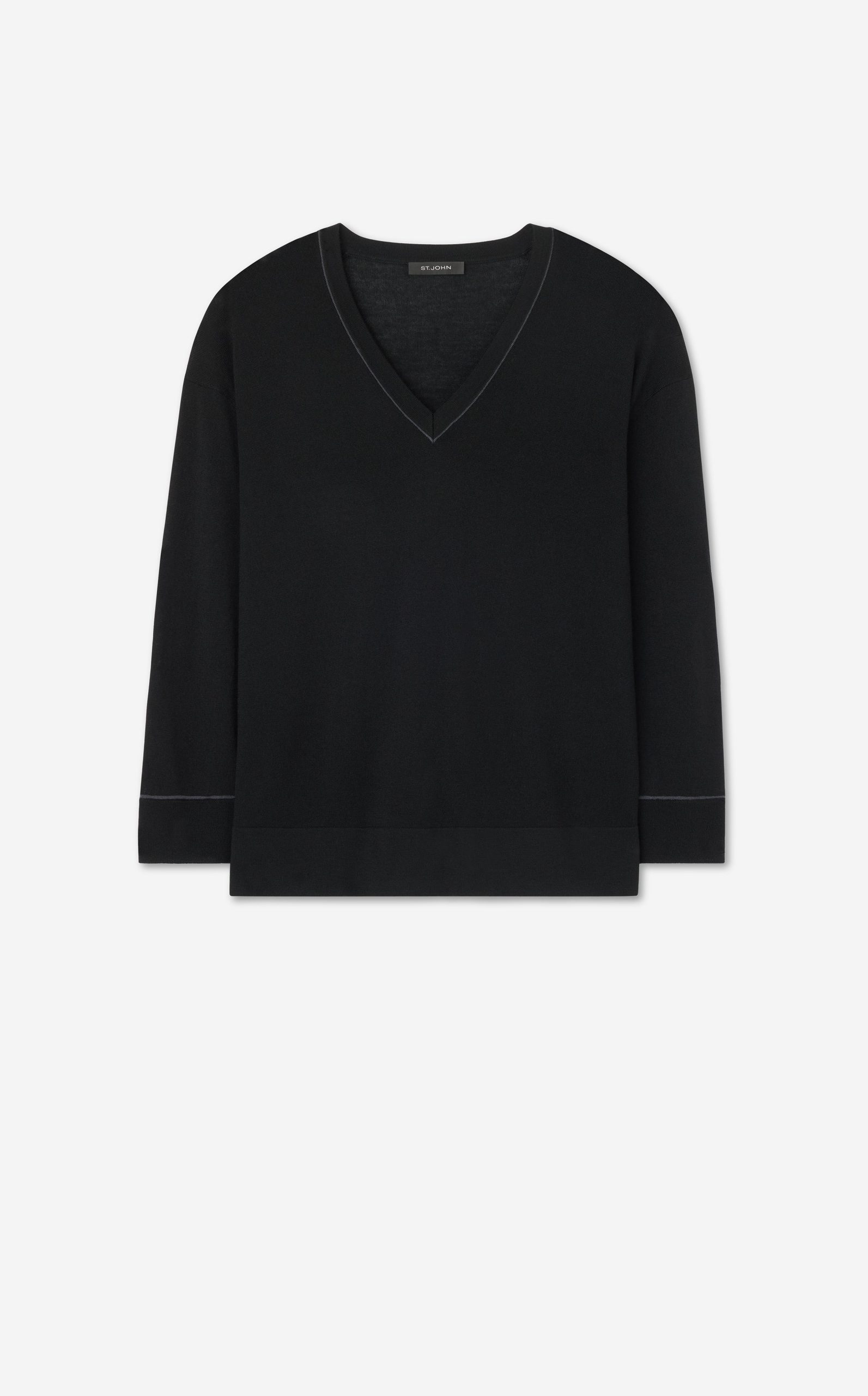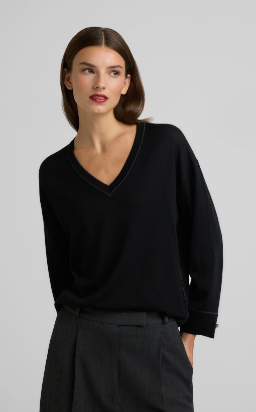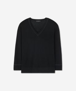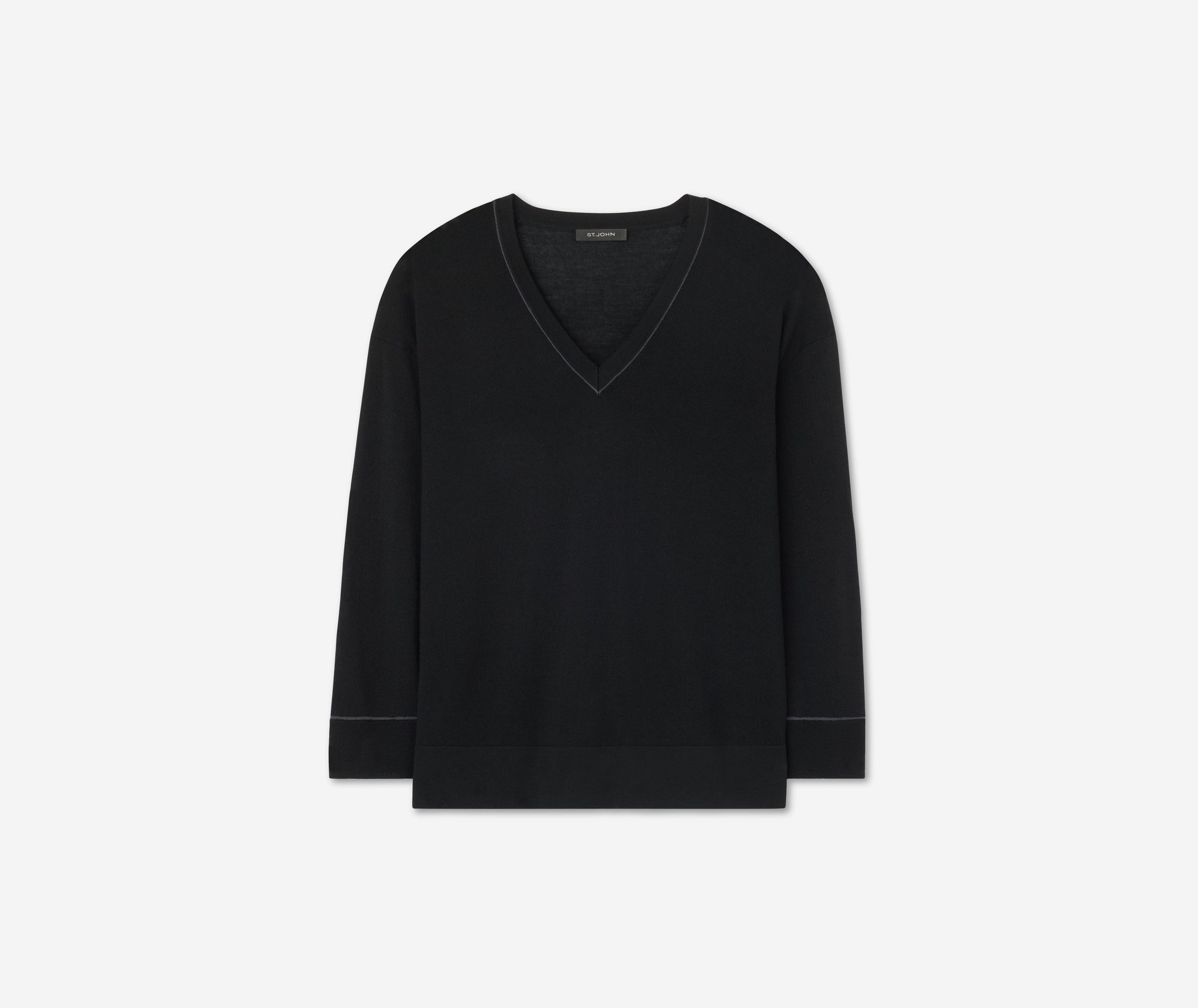 An effortlessly cool relaxed fit sets the tone for this staple V-neck sweater with accented trims, knit in Merino wool for a soft and warm fit.All Sales are Final. No Returns or Exchanges.