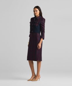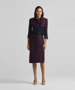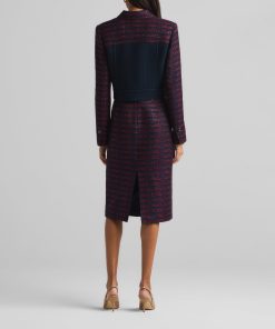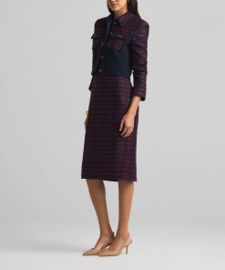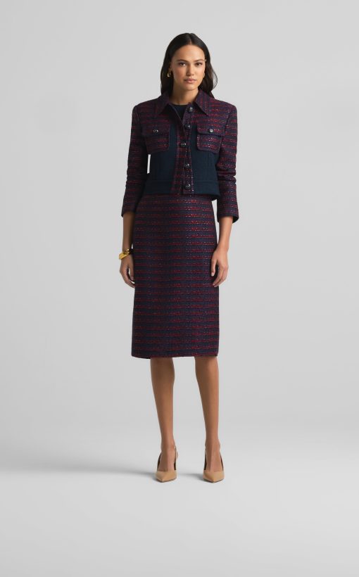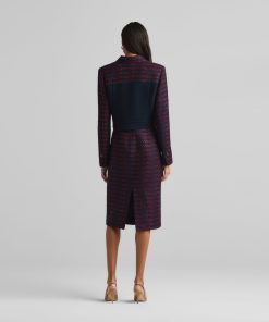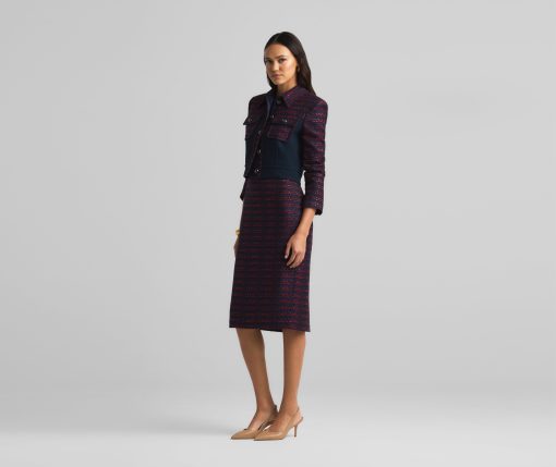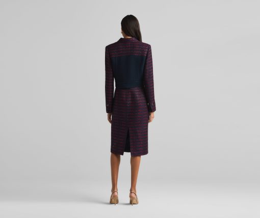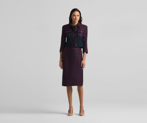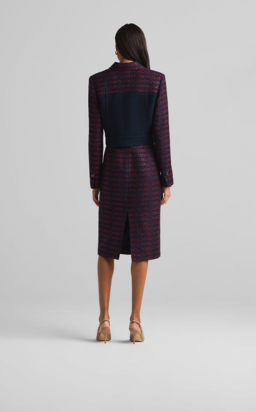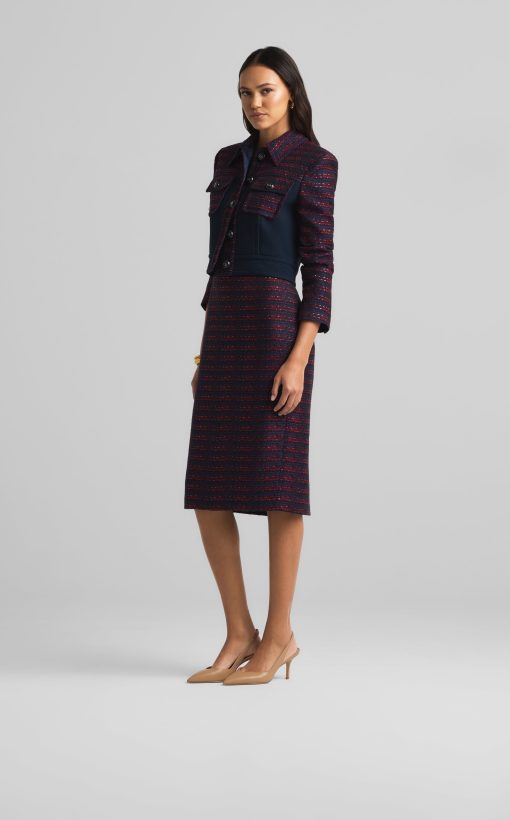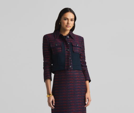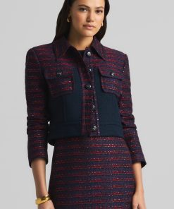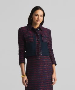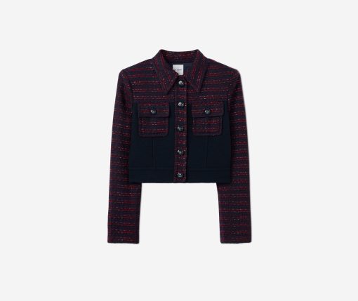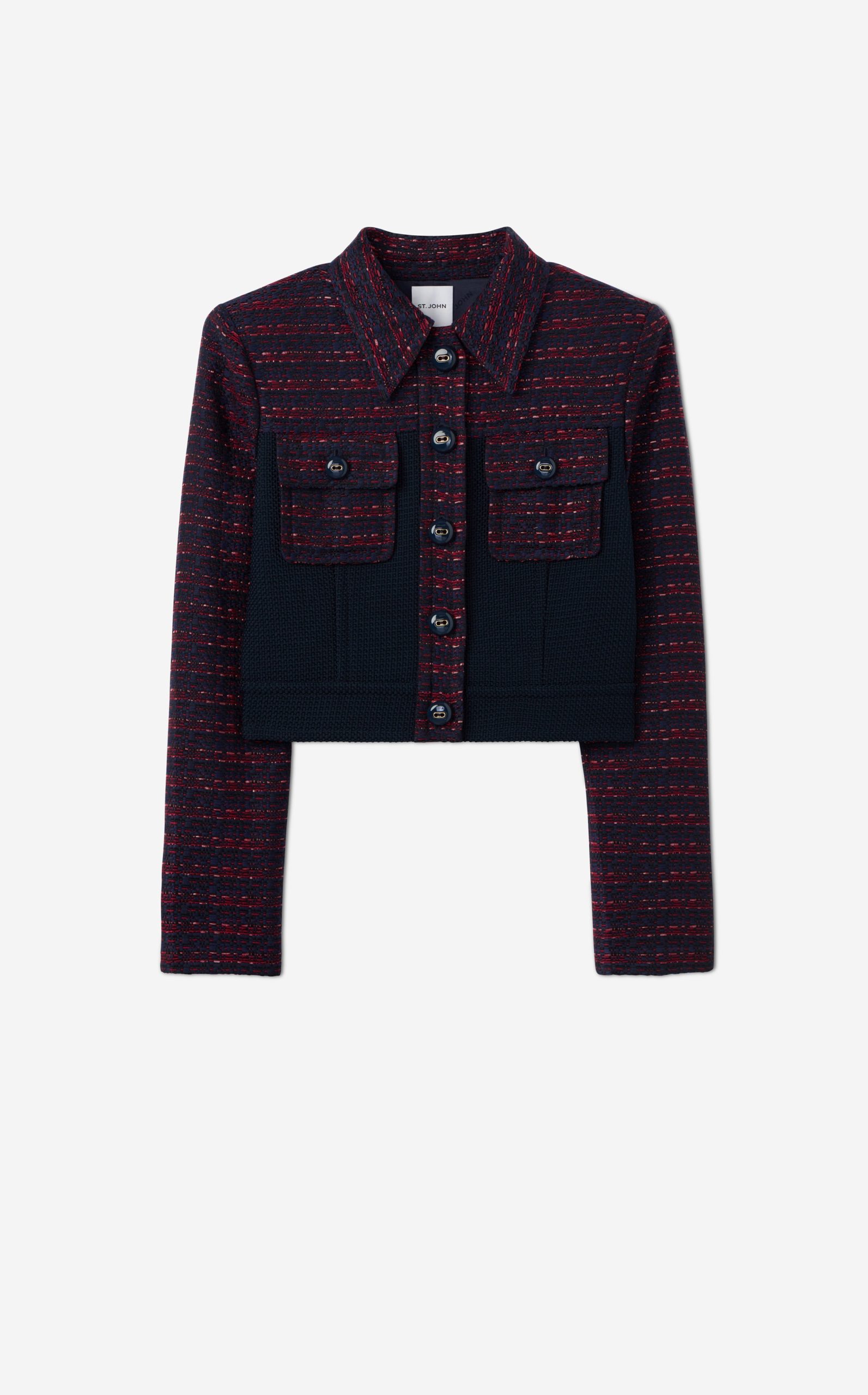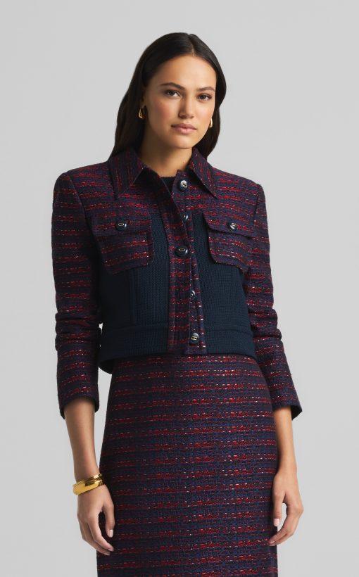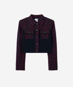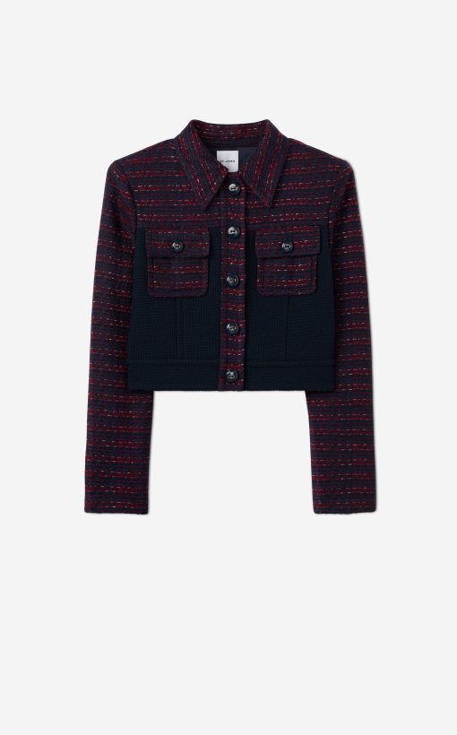 A short, collared jacket incorporates both a textured tweed and a solid knit. Flap pockets and large buttons complete the mixed media piece.All Sales are Final. No Returns or Exchanges.