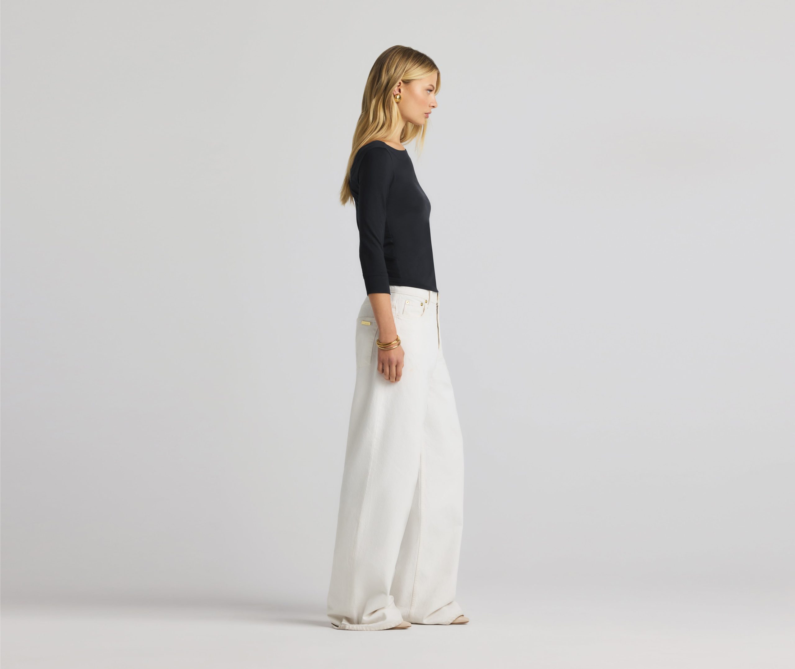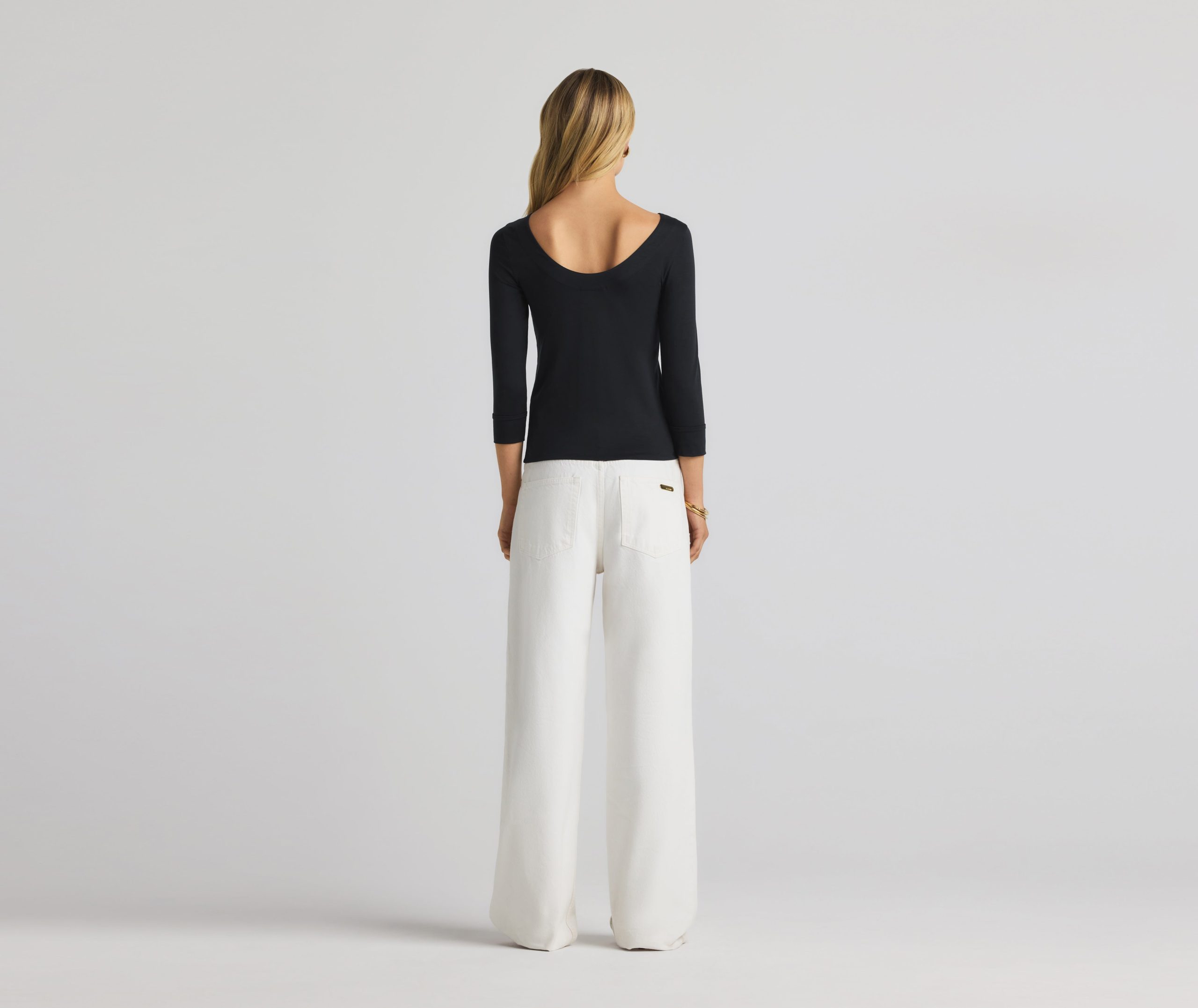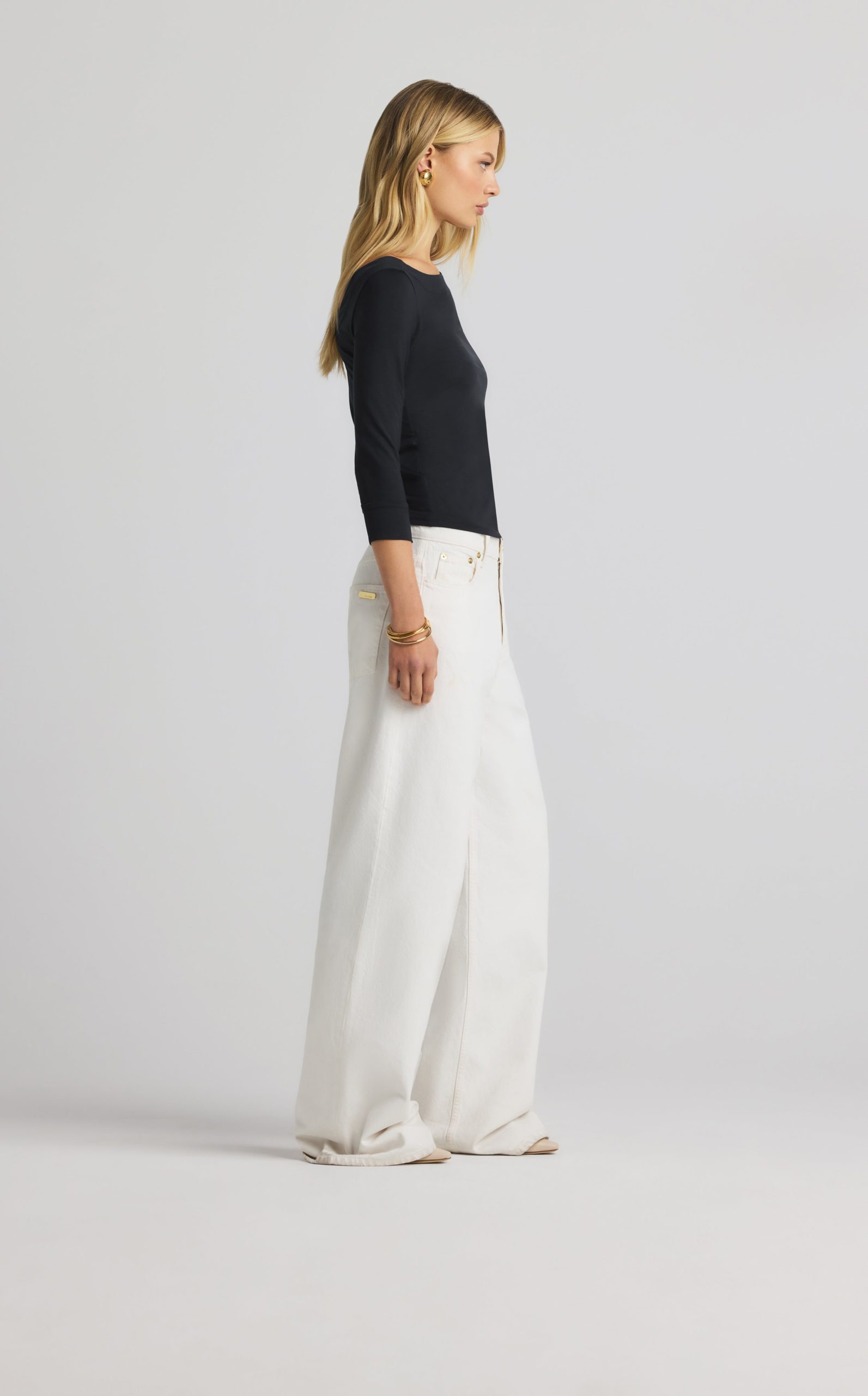 The chicest of classics, this simple bateau neck polished jersey top features 3/4 sleeves and a subtle St. John logo.