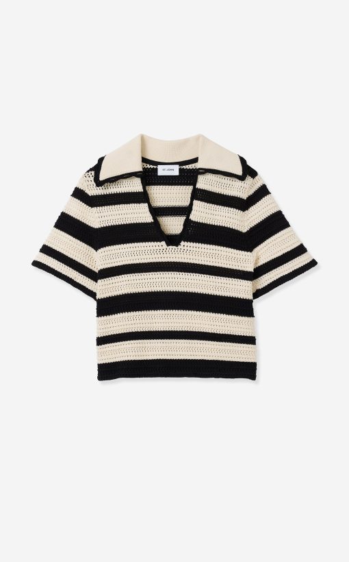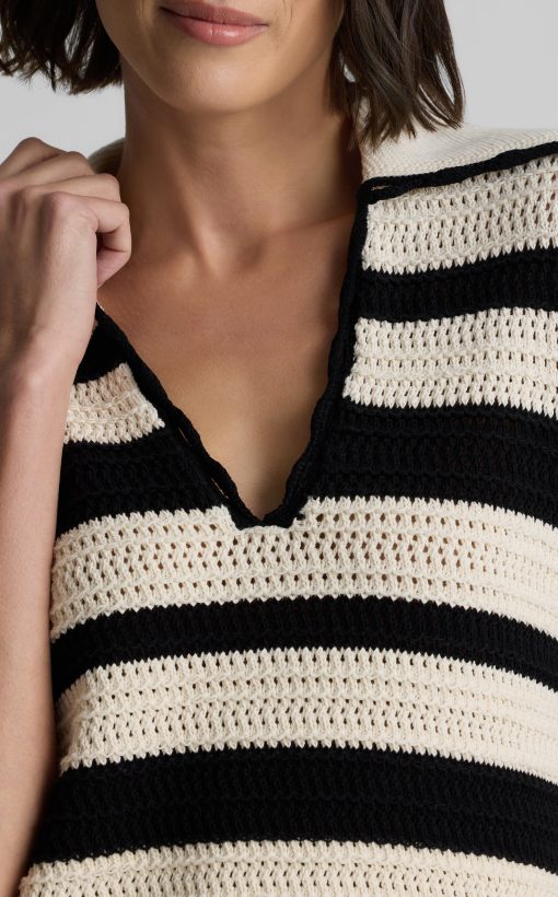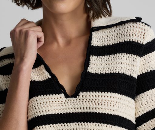 Featuring a seamless pairing of both retro and modern design details, the Reagan nods to the past while feeling fresher than ever for present day wear. With its breezy Striped Pointelle Knit, relaxed t-shirt sleeves, and wing collar, this sweater is a refined take on the classic polo tee, offering your warm weather wardrobe a touch of sporty chic charm that can be worn so many ways.