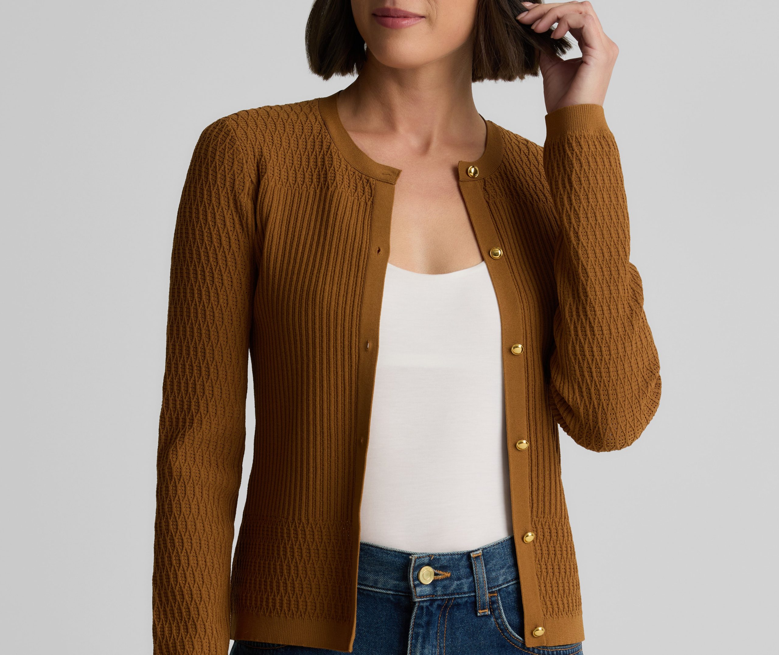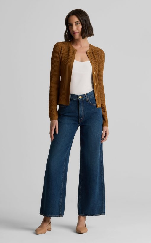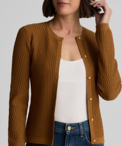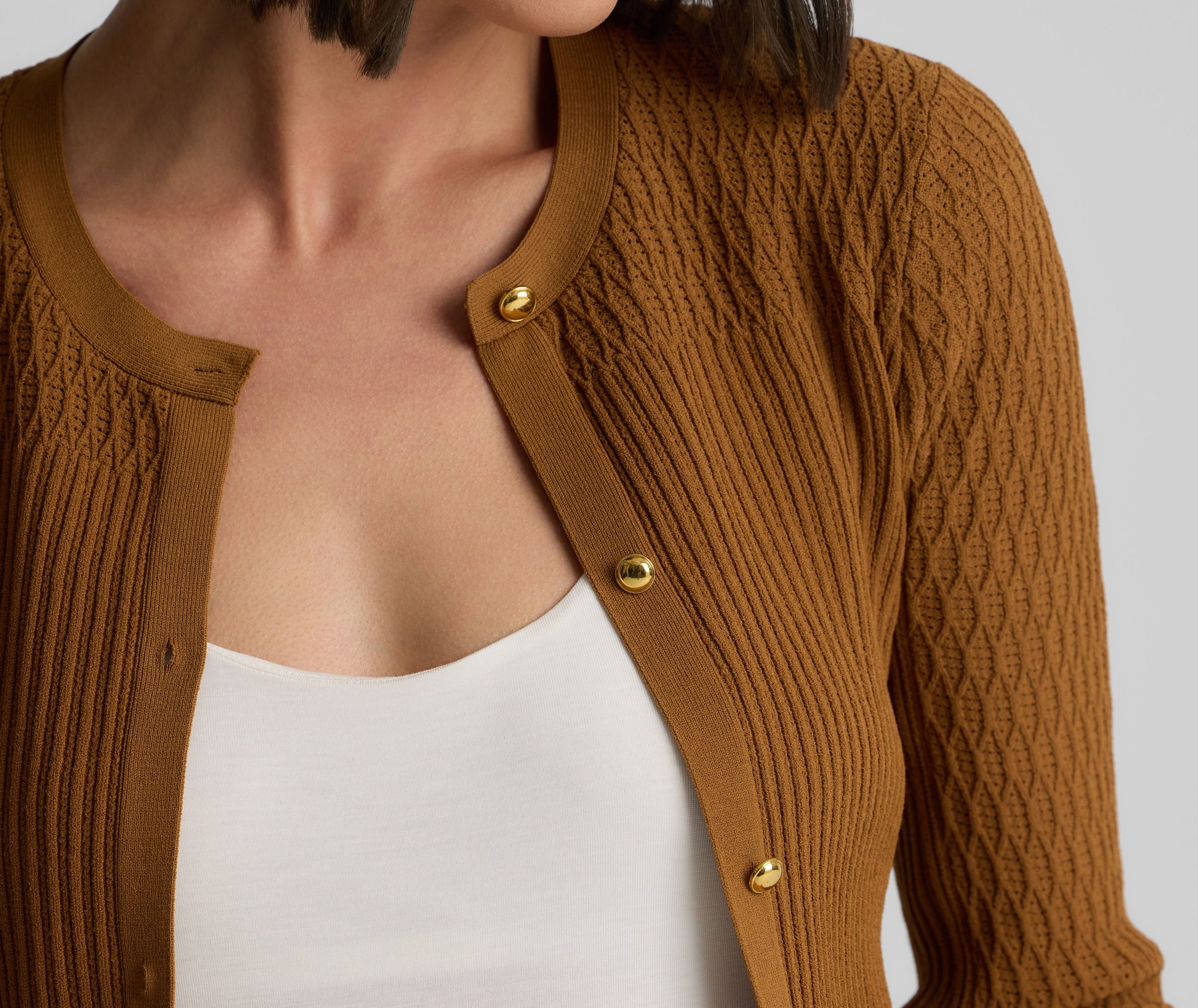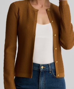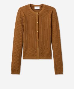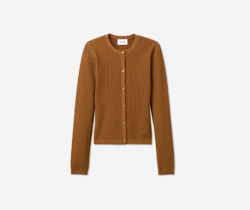 The River’s slim fit and delicately ribbed texture gives the classic cardigan an elevated update. Made from our Fine Mixed Knit and subtly embellished with gold buttons, this luxurious layering piece in rich Cinnamon pairs perfectly with the Wren Shell to create a coordinated twin set, but can also be mixed and matched with other tees and camisoles for endless possibilities.