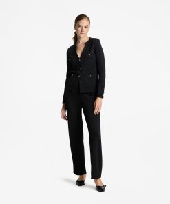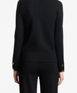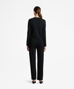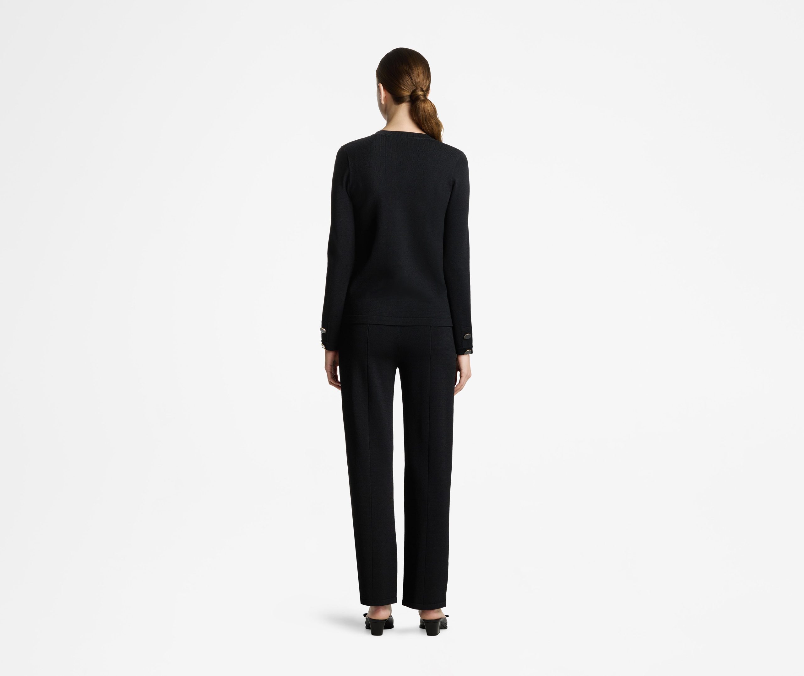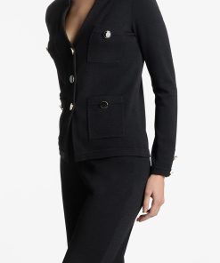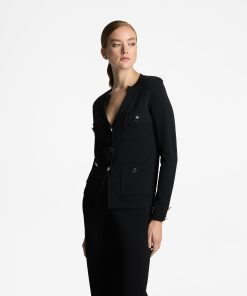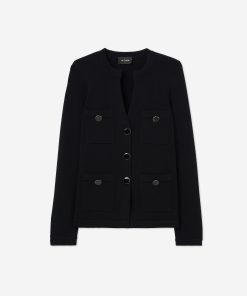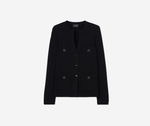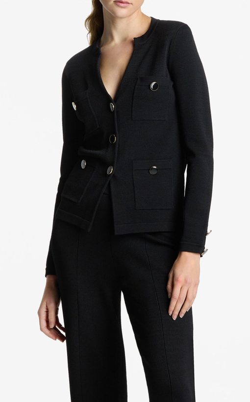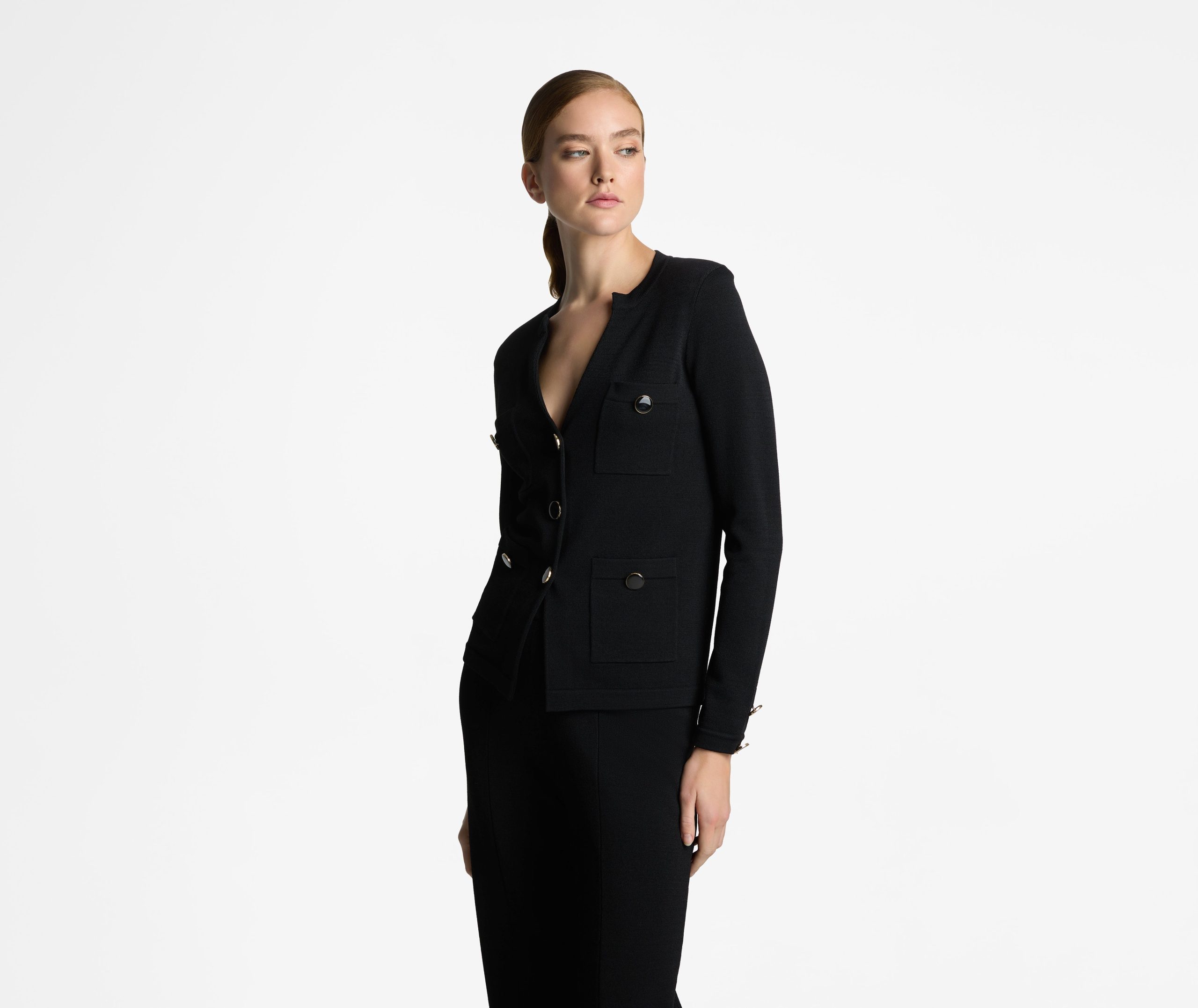 A modern neckline with an open V draws the eye to this chic Santiago Knit button front jacket, a luxurious knit that holds its shape through a lifetime of wear.